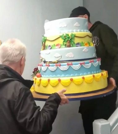 ▼由於蛋糕真的太高,讓烘焙坊的老闆必須分成兩次來製作,並且到現場才進行「組裝」。