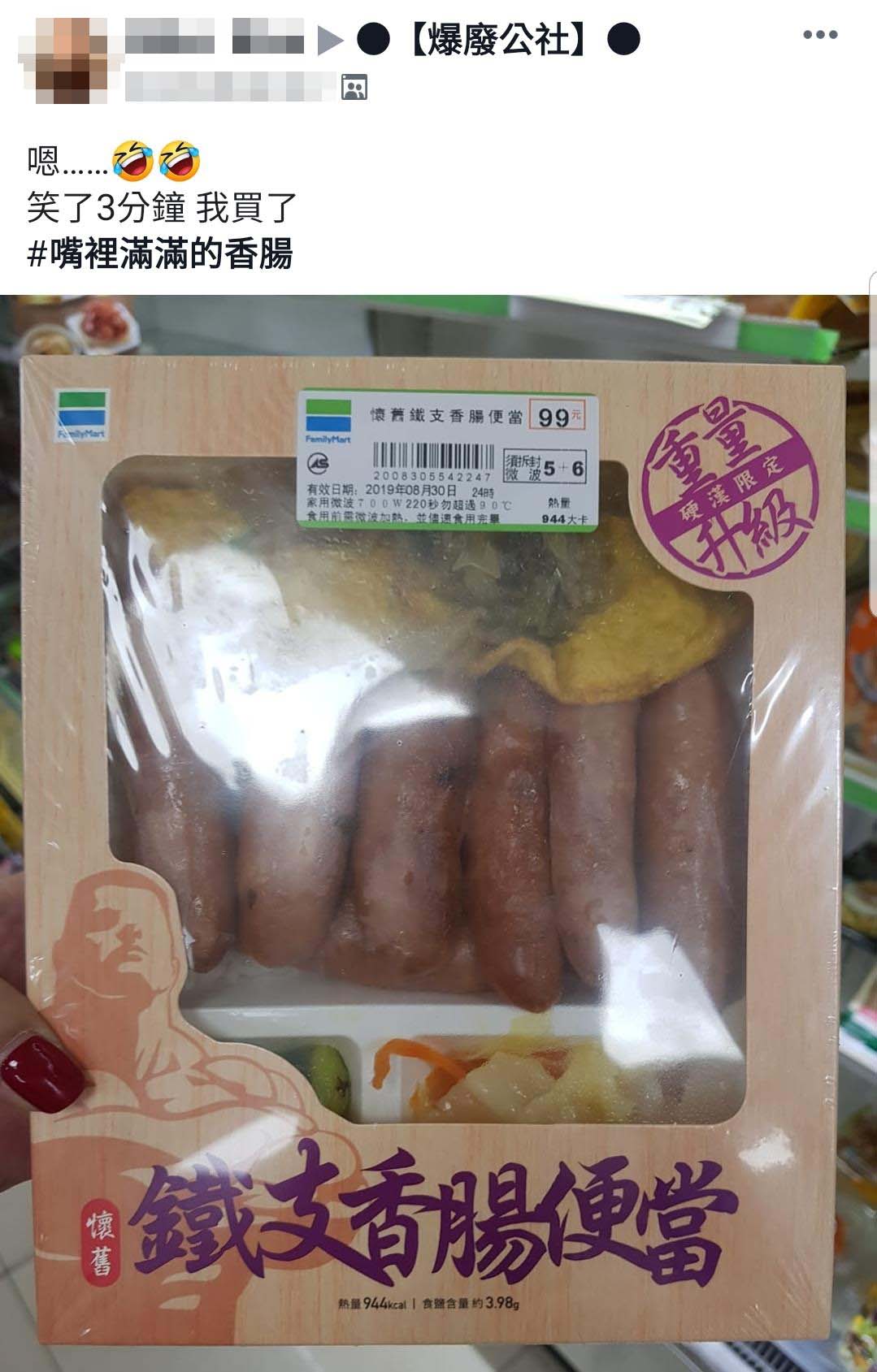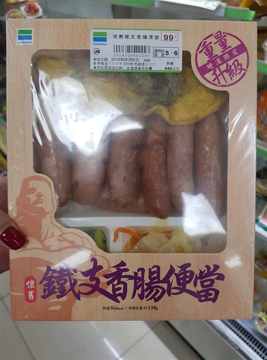 ▼事實上,早在幾個月前,也有一位女網友發現這款便當,她表示看到滿滿的香腸後,笑了3分鐘買了。鐵支香腸便當的外包裝也非常有話題,標榜懷舊口味外,還寫重量升級、硬漢限定!背景就是一個硬漢!
