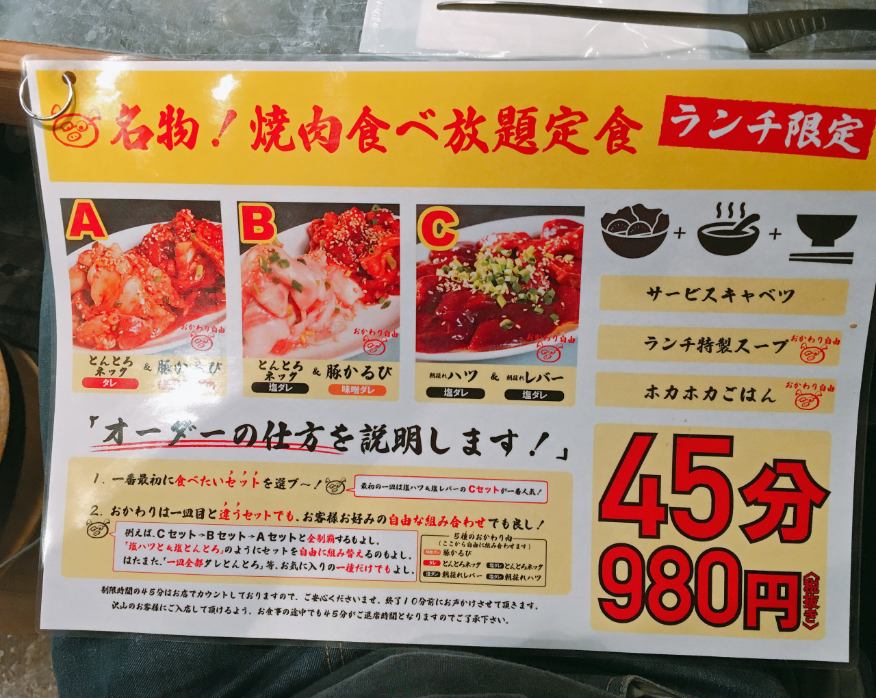 ▼店如其名,這間店是以豬肉為主的燒肉店,午餐時段只賣豬肉的燒肉吃到飽。第一盤先從A「豬頸肉(醬汁)&豬五花(味噌)」、B「豬頸肉(鹽味)&豬五花(味噌)」、C「豬心(鹽味)&豬肝(鹽味)」三選一,之後可以自己隨意搭配喜歡部位。