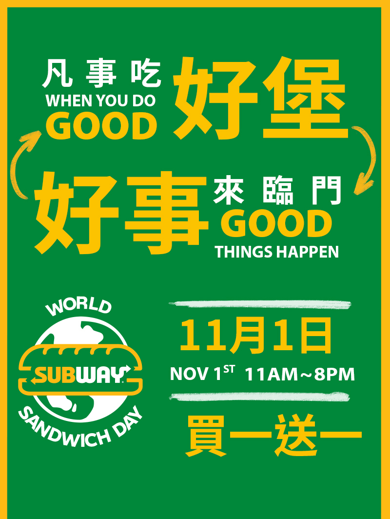 2019年10月23日潛艇堡控注意!世界三明治日(11/3)即將到來,而Subway也將於11/1推出一日限定買一送一優惠共襄盛舉!