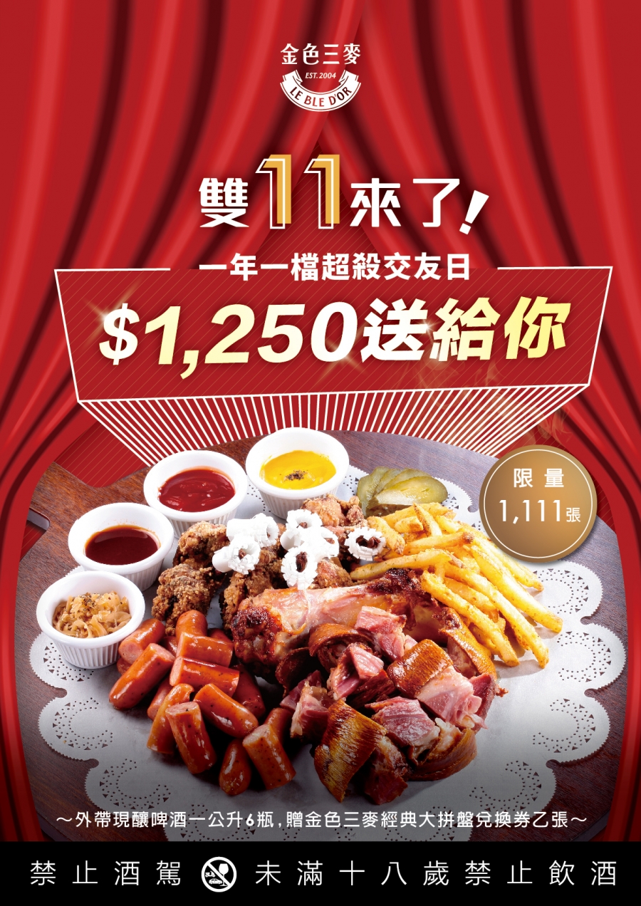 ▼另外金色三麥在雙11也有獨家優惠!在11月11日當天來到金色三麥門市,外帶現釀啤酒1公升6瓶,即送價值1250元的「金色三麥經典大拼盤兌換劵一張」!全台僅限1111張,數量有限,送完為止。