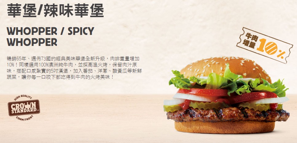 ▼漢堡王的華堡熱賣至今已經超過65年,在全球73個國家的門市中都能享用到這無法言喻的美味!使用了100%澳洲純牛肉製造而成的肉排,使用高溫火烤後搭配新鮮番茄、洋蔥、酸黃瓜等新鮮蔬菜,讓你每一口能夠吃到牛肉的美味!