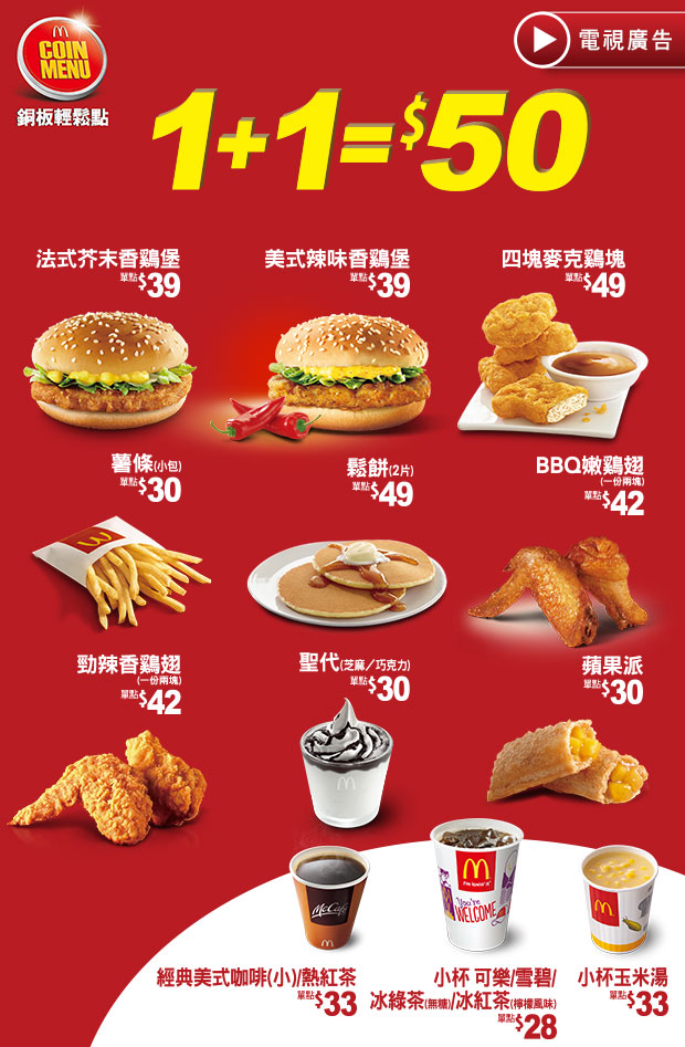 ▼麥當勞1+1=50元的「銅板輕鬆點」超優惠組合,深受學生們喜愛,成為學生們放學後想要吃些小點心墊肚子的首選。