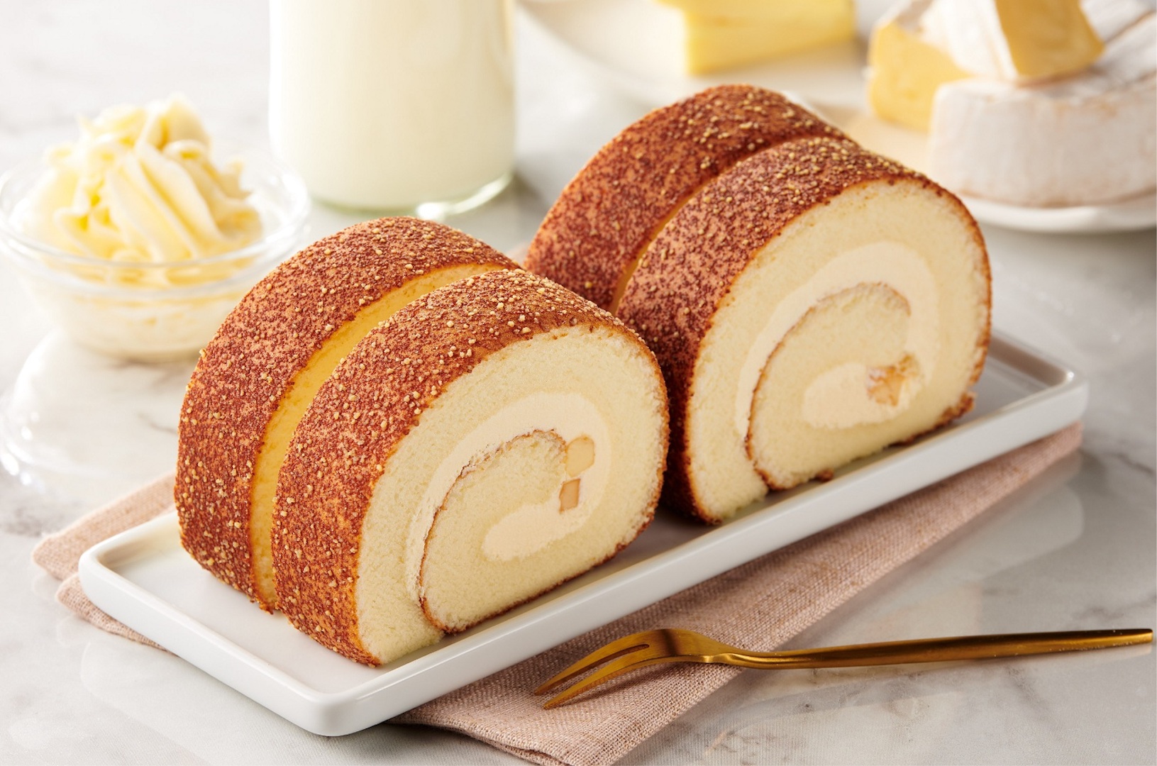 ▼冰心捲蛋糕(帕瑪森起士):使用紐西蘭乳酪丁、荷蘭帕瑪森乾酪及丹麥起士粉製成,乳酪戚風遇上乳酪丁,多種乳酪交織出綿密滑順的鹹甜滋味。