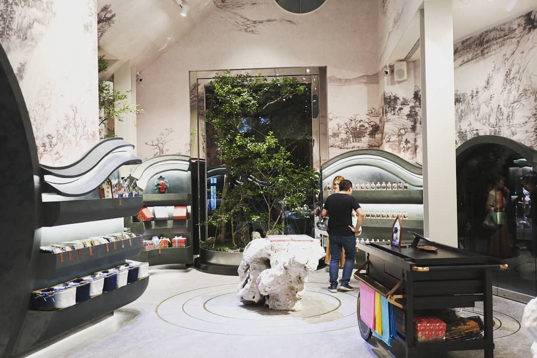 ▼整體店面充滿著東方古典的設計美感,隨處可見的潑墨山水壁畫、圓形拱門,以及白色岩石作為展示用的陳列架,現代與詩書交疊出全新的典雅美。