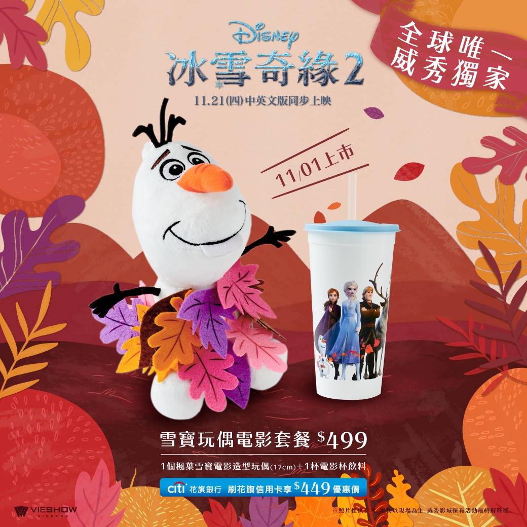 ▼威秀公開《冰雪奇緣2》就受到萬眾矚目,這次分別有楓葉雪寶玩偶、雪寶招手帽、雪寶伸縮鑰匙圈,以及冰雪公主和雪寶兩者為主題的飲料杯和米花桶,想收藏的往下看~