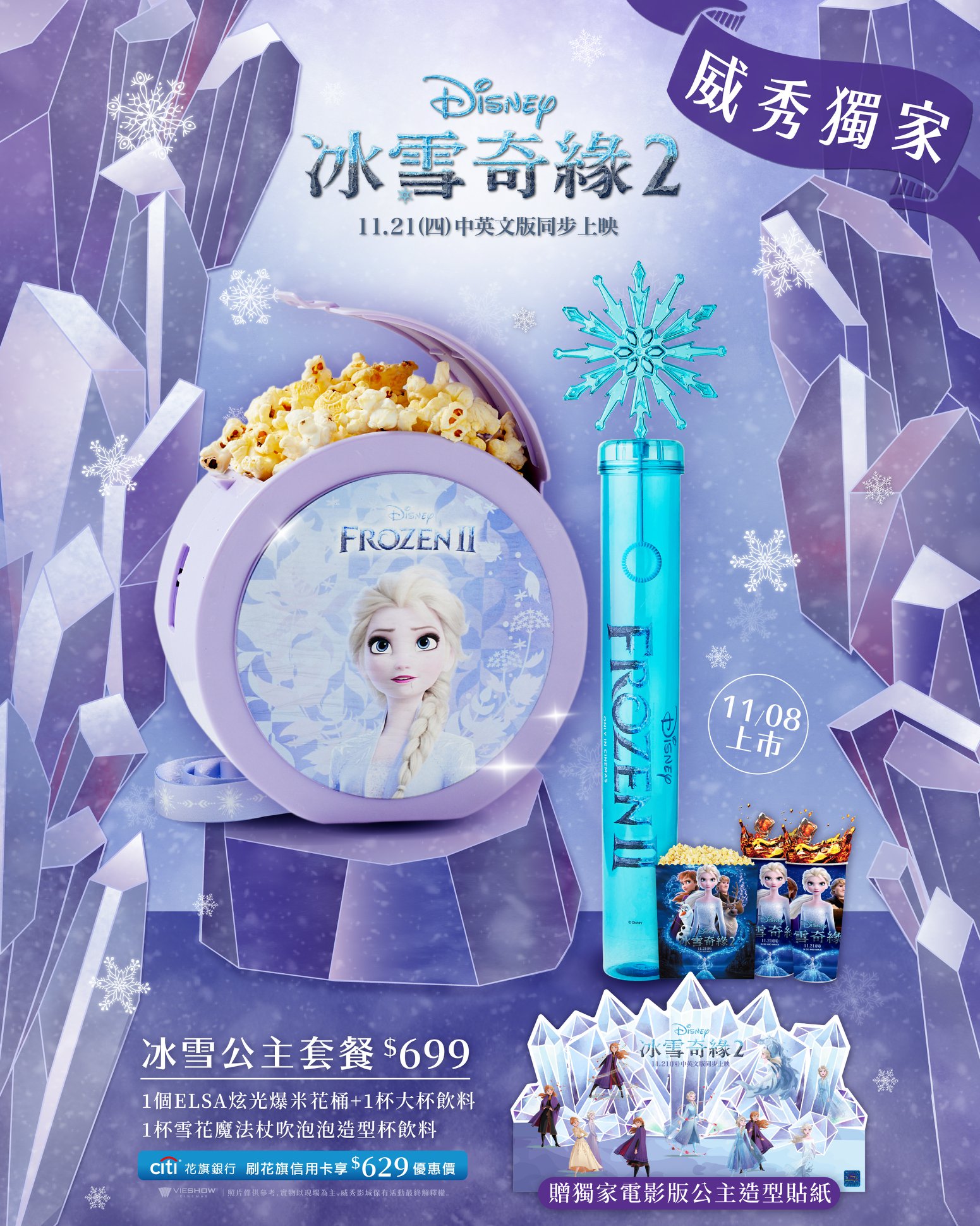 套餐內容:1個ELSA炫光造型米花桶+1杯雪花魔法杖造型飲料杯+1杯大杯飲料,贈送「獨家電影版貼紙」