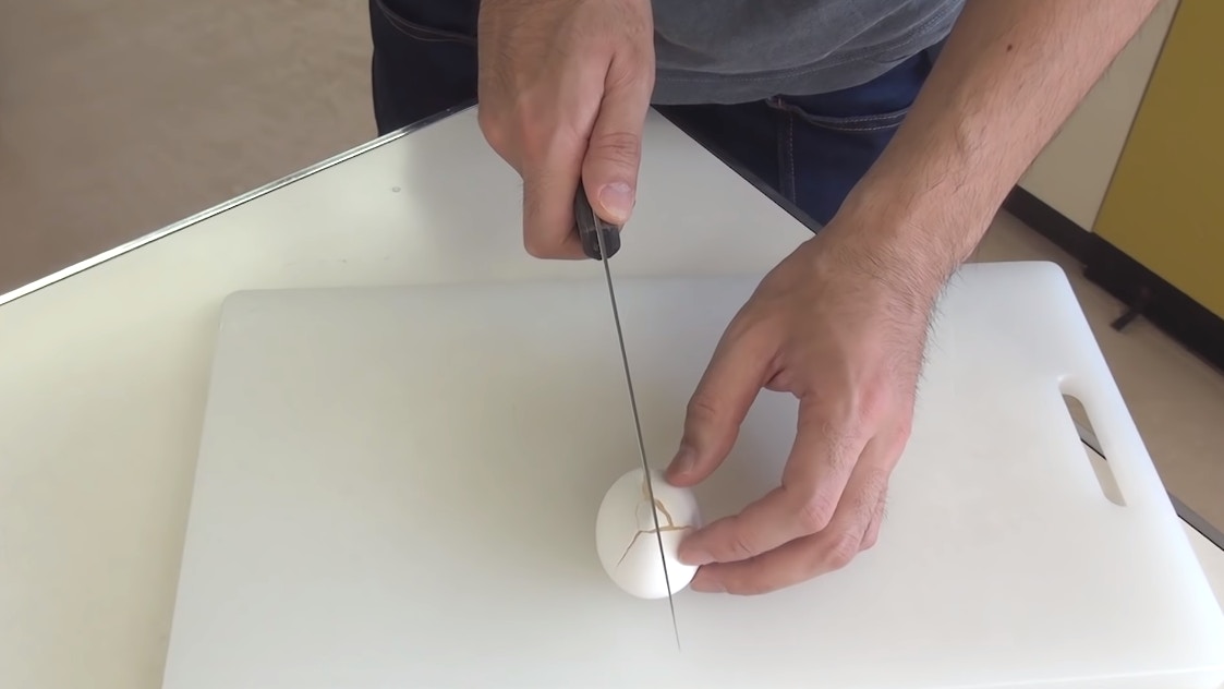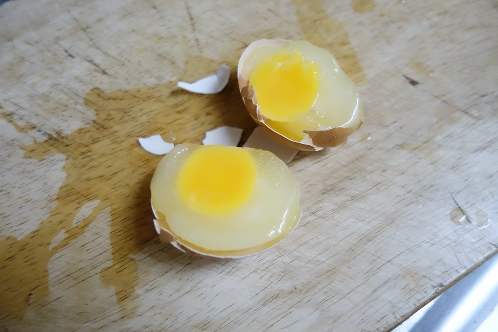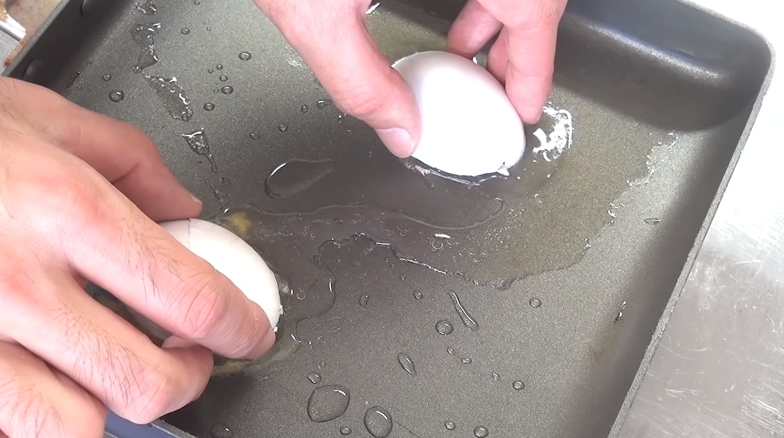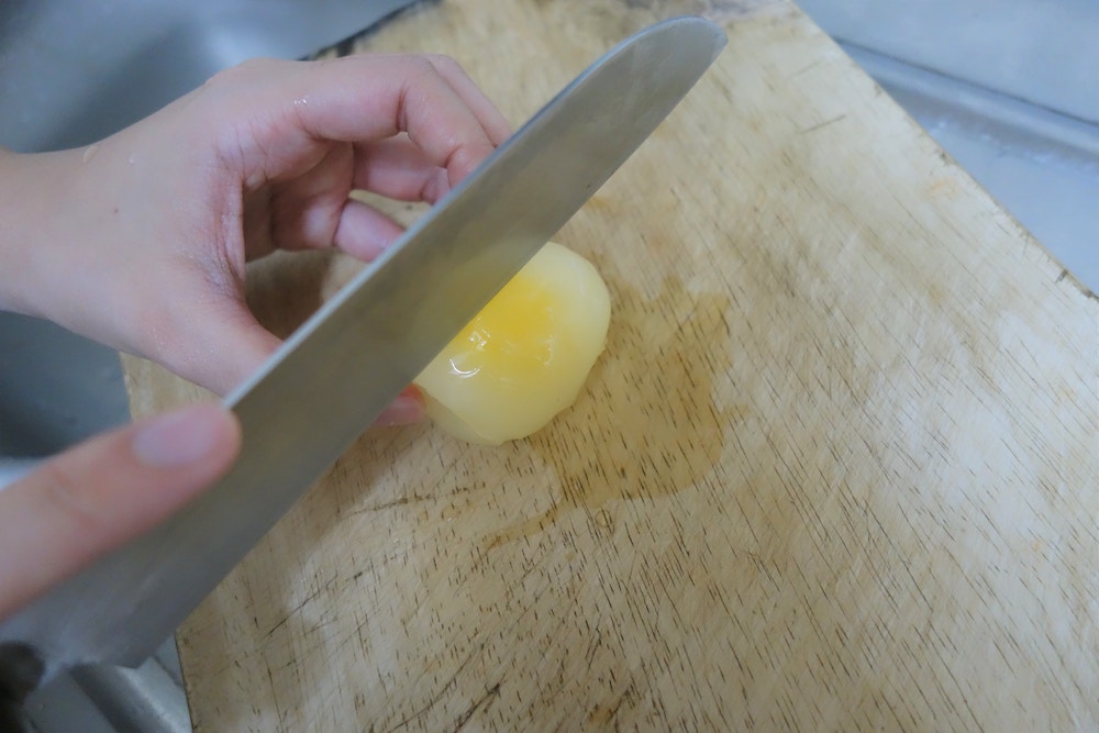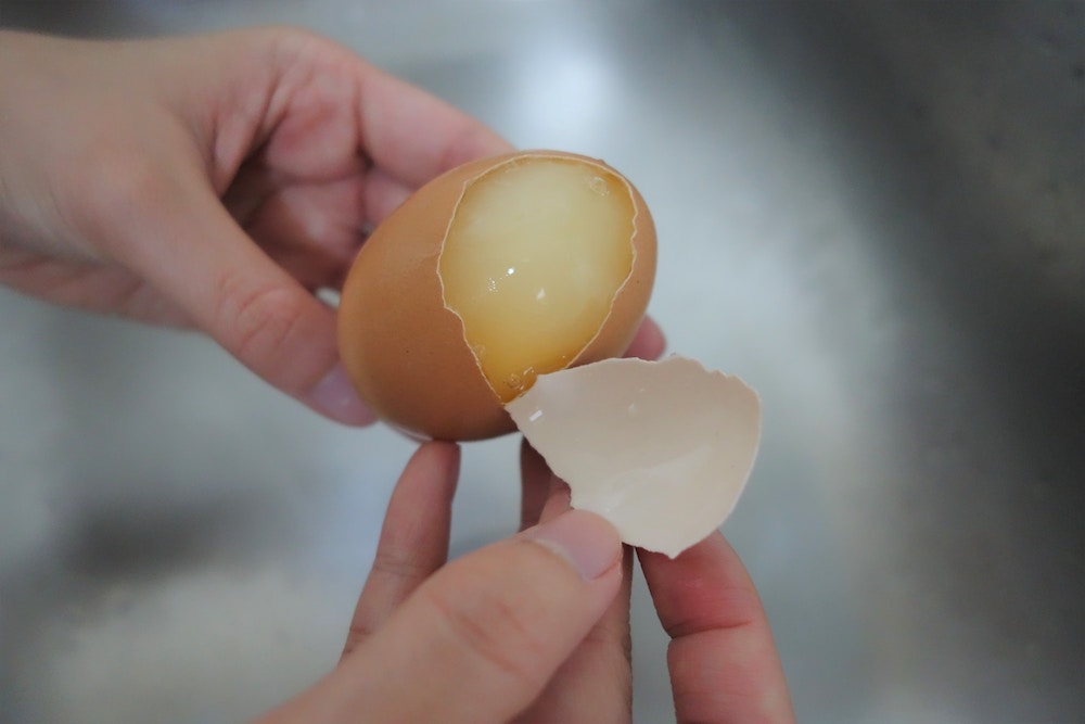▼如果按照Benri的做法,不去殼直接將雞蛋切成兩半,蛋液上很可能沾到蛋殼;