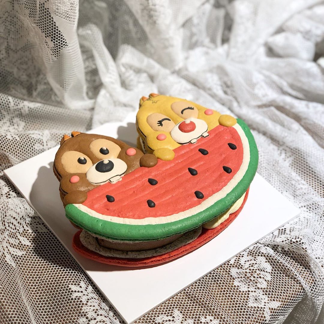 ▼過去在迪士尼發售的「奇奇與蒂蒂吃瓜」造型米花桶,Cafe Avllim也有做出馬卡龍版,實在Q到不行!