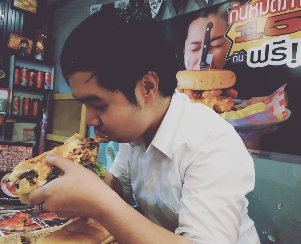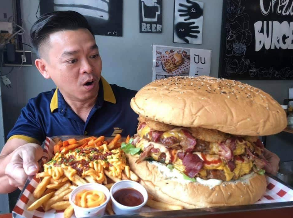 ▼漢堡店的老闆Komdech Kongsuwan說,這是全泰國最巨型的漢堡。有一次他看到3位客人分吃一個漢堡,於是開始舉辦大胃王比賽。現在幾乎每天都有人來參賽,但還沒有人能拿走獎金。