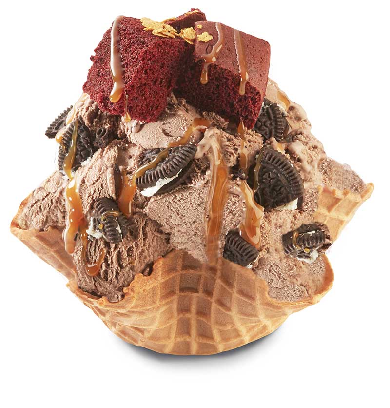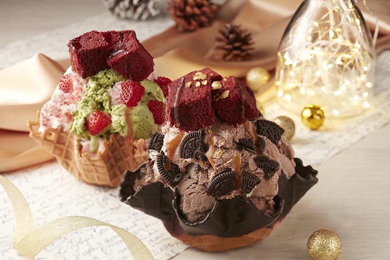 ▼「巧克金聖誕」不惜重本、嚴選巧克力界超人氣霸主-Hershey’s好時純天然可可粉入冰,黃金比例加倍製成濃巧克力冰淇淋,極致濃醇的巧克力香無限蔓延,更以拉斯維加斯「顛覆想像」、「極致奢華狂野」的意象為創意發想,拌入美國經典OREO,放上高貴典雅的紅絲絨海綿蛋糕,鹹香綿密多層次味蕾,特別點綴金色雪花片,最後淋上滑順的太妃糖醬,完美呈現滿足視覺味蕾的藝術冰品。