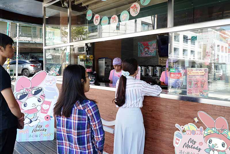 ▼店面牆上掛著美樂蒂到清心福全消費拍照的旗幟,一旁還有美樂蒂與手搖飲元素互動的人形立牌,美樂蒂一身時尚的穿搭加上天真表情、俏皮動作,超級吸睛。而吧檯、串旗、帆布、海報、螢幕、菜單等,全都有活潑開朗的美樂蒂。門市人員還換上了粉紅色的制服,搭配粉紫色的圍裙與帽子,並別上可愛的美樂蒂胸章,可說誠意十足。