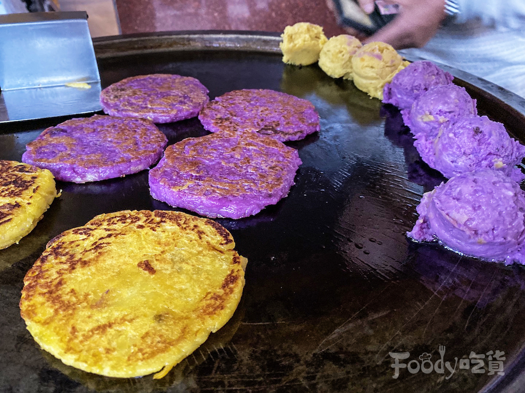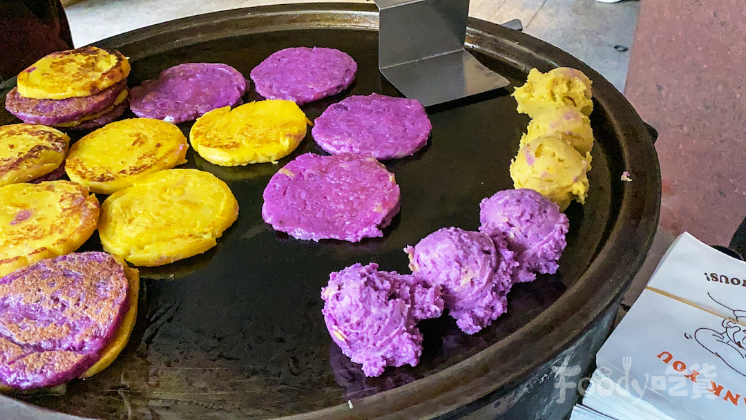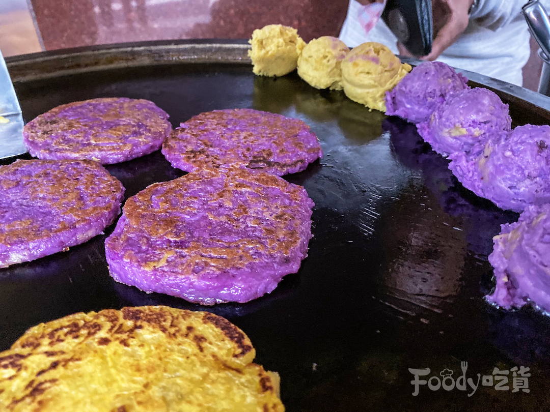 ▼地瓜泥、山藥泥被一球球擠到煎台上,有點像冰淇淋XD;看阿伯熟練地把它們在鍋上抹平、煎成「恰恰」的微焦感,莫名有點療癒耶~