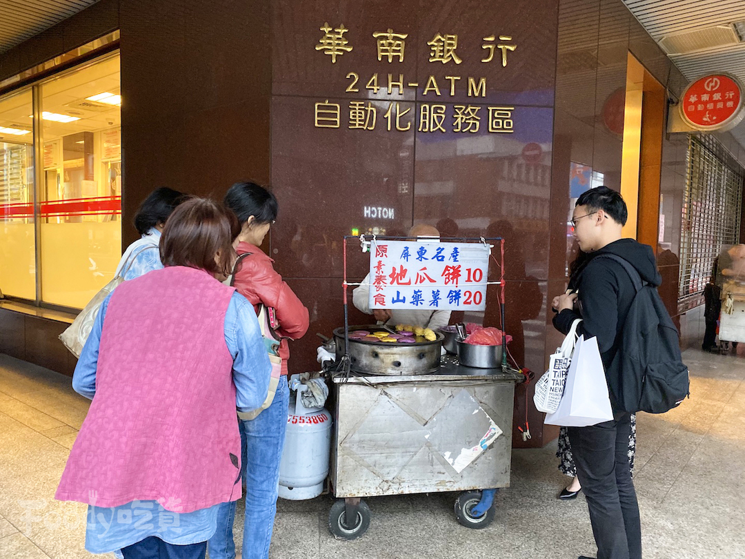 ▼這家無名山藥薯餅只簡單寫著「屏東名產」及地瓜餅10元、山藥薯餅20元的價位,就在華南銀行門口,不起眼的小攤位只有阿伯一個人,旁邊卻是排了一堆人!