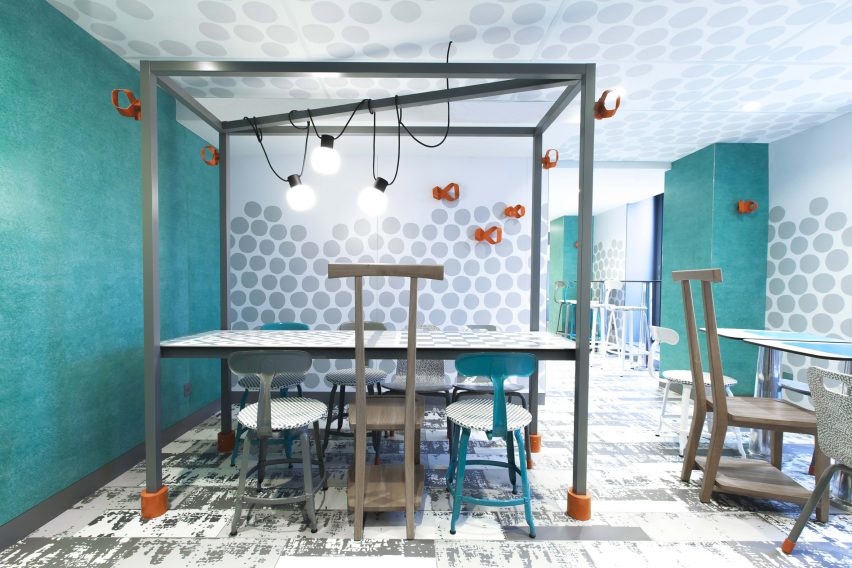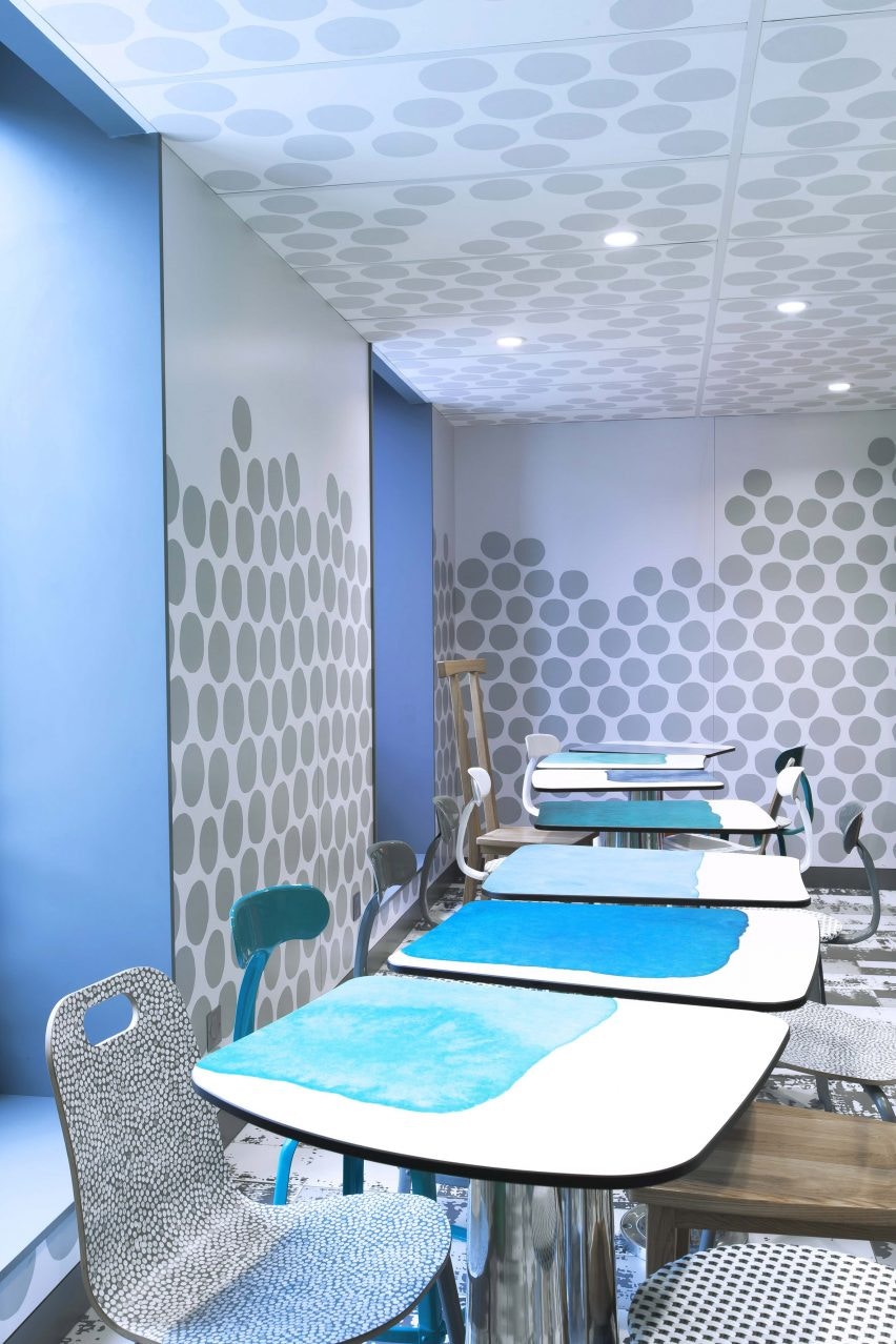 ▼桌椅種類不一,有手繪感的水藍色桌子、木製高腳椅、湖水綠的圓形椅、流線型設計膠椅等等,充分展現了設計師的想像力。
