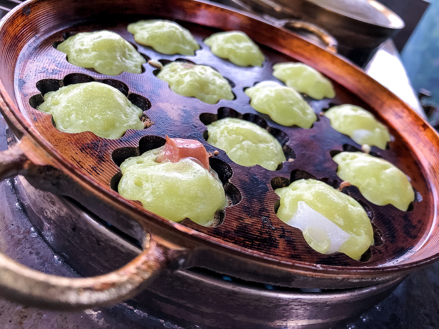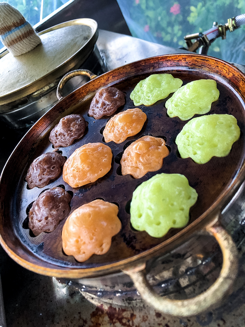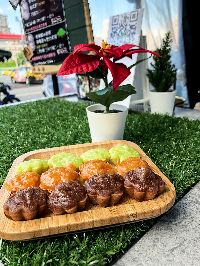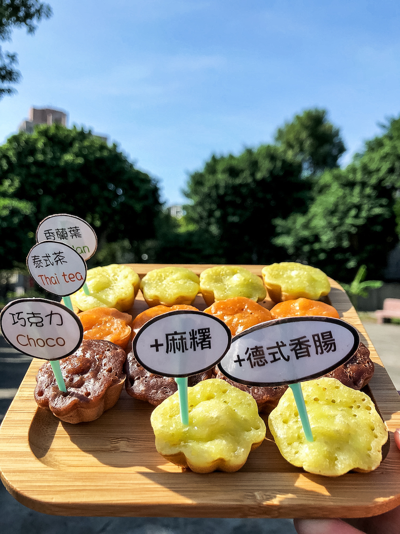 ▼甜糕分成有包餡跟沒包餡的,其中沒包餡的有經典「香蘭葉」及「泰式茶」、「巧克力」三種口味,點一份綜合口味就能一次吃到,一鍋剛好每種口味各4個,可愛的配色烤的時候看起來超療癒,而且12顆只要銅板價40元!