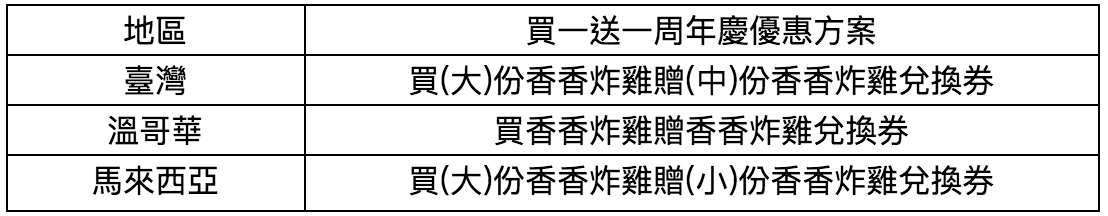 ▼這一次週年慶的「買一送一」活動還特別加碼,不但從往年的6天變成8天,為慶祝繼光香香雞全球門市達到350間,這次在加拿大溫哥華、馬來西亞的門市也共同加入「買一送一」行列!(各國優惠不同,可參考下圖)