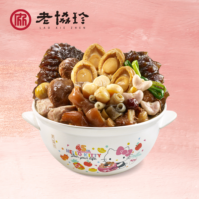 2019年11月25日老協珍今年的年菜實在是沒有極限!繼之前小七的「卡娜赫拉、米奇佛跳牆」年菜預購開跑後,這次又聯手三麗鷗大明星,在全家推出「Hello Kitty 45週年佛跳牆」,粉白少女配色超級少女心~