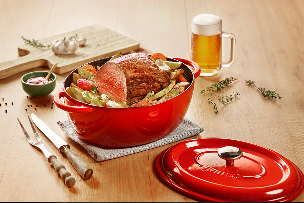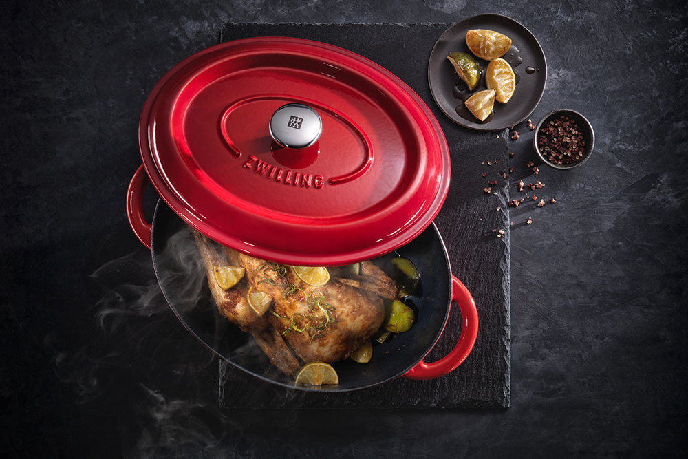 ▼琺瑯鑄鐵橢圓鍋:經典紅鍋身搭配內層灰色亮琺瑯,容量大,可燉煮全雞及較大份量的料理。