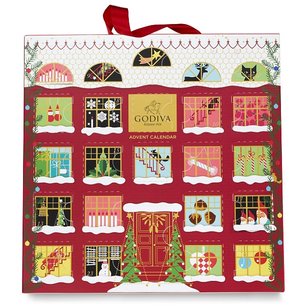 ▼「GODIVA 2019 聖誕倒數日曆巧克力禮盒24顆裝」售價2400元,限量【2019聖誕限定贈品】凡購買GODIVA 2019聖誕倒數日曆巧克力禮盒24顆裝乙盒就送GODIVA節慶裝飾吊飾組乙組(一紅一綠,可累贈,數量有限,贈完為止)。