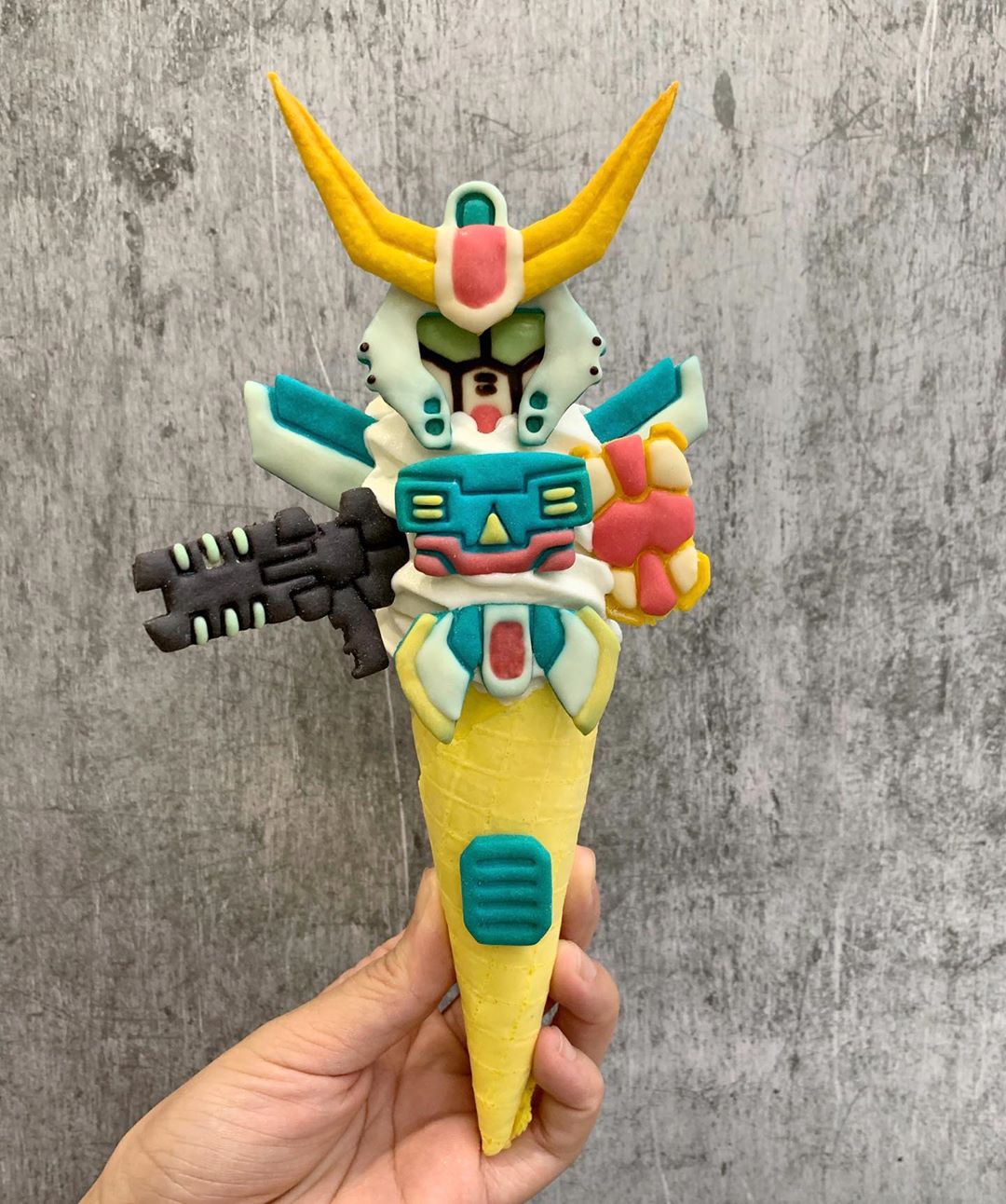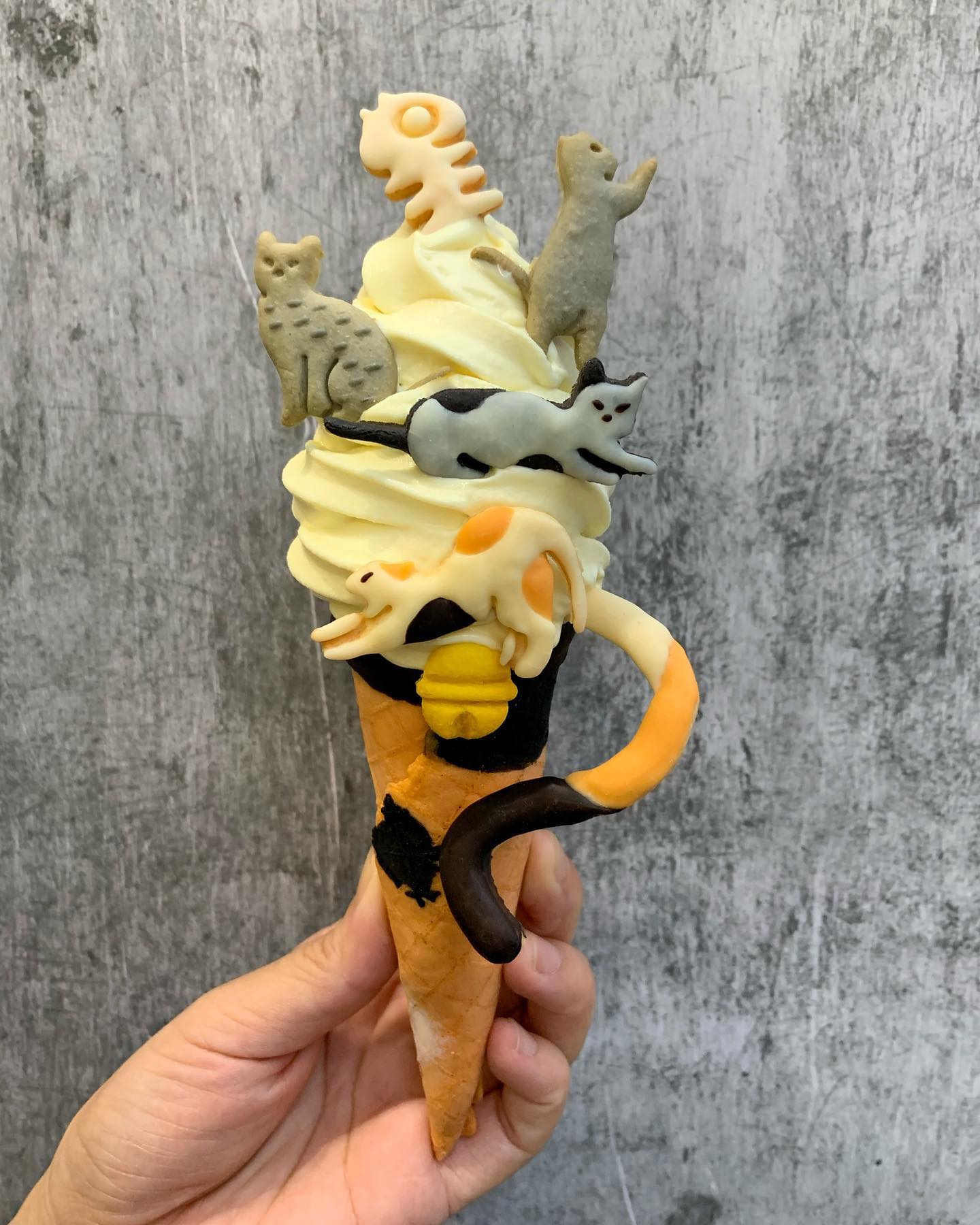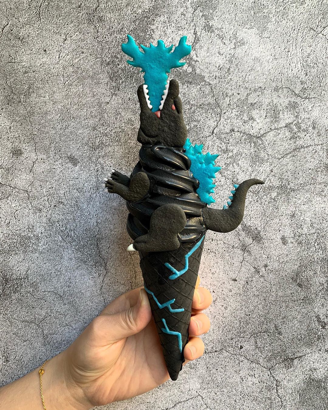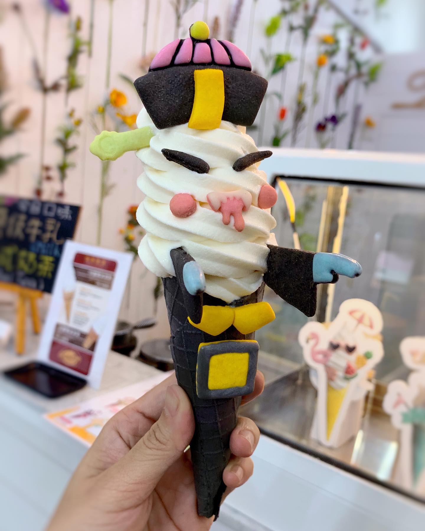這霜淇淋實在太有創意了,沒想到黑黑的霜淇淋體竟然會變成怪獸之王的身體,而且看起來渾然天成,完全無違和,還莫名地讓人想要一口咬下去欸XD。