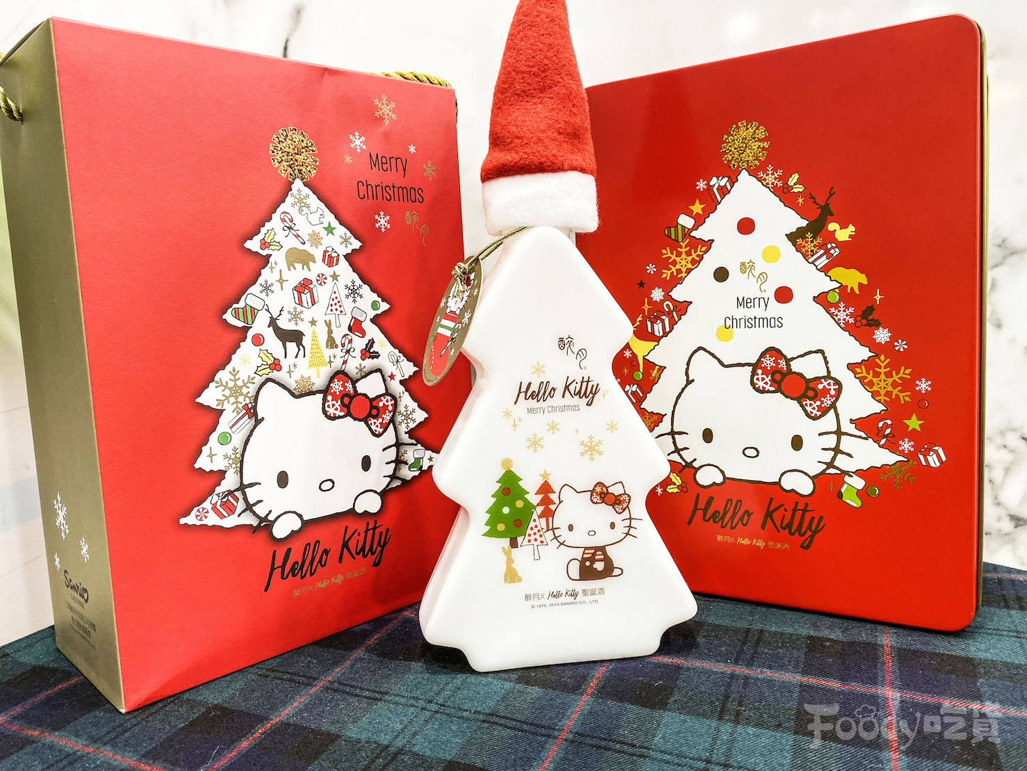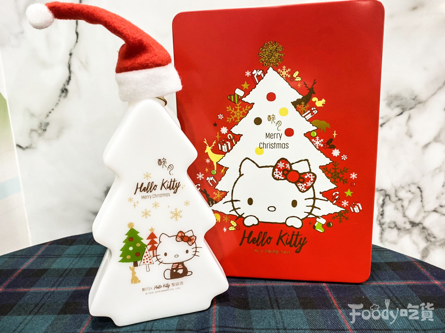 ▼HELLO KITTY「聖誕荔枝風味酒」:以日本極致工法,做出潔白如玉高質感。搭配聖誕樹造型瓶身,包裝首次採用多層次印刷金屬容器,收藏送禮最佳選擇。