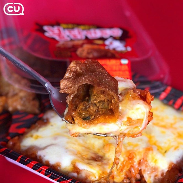 ▼再來這款是 CU 便利超商推出的「辣雞焗烤餃子飯」,從照片中可以看到,這次的餃子連皮也變成了紅色的,雖然上面鋪滿了滿滿的焗烤,可是看起來還是辣得令人冒汗!