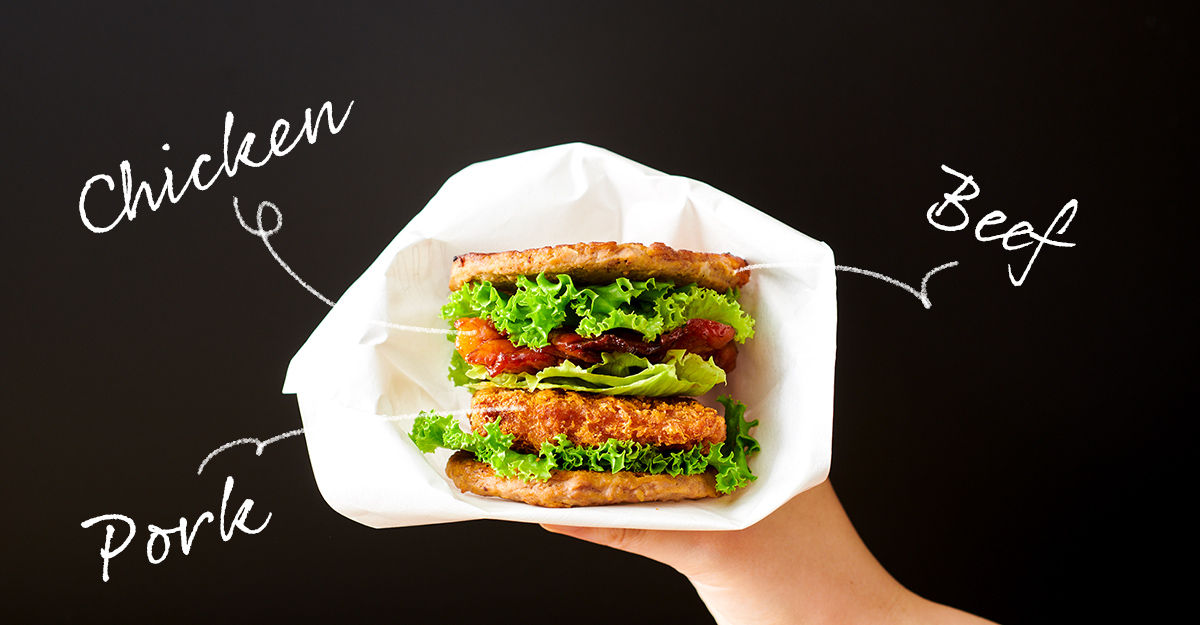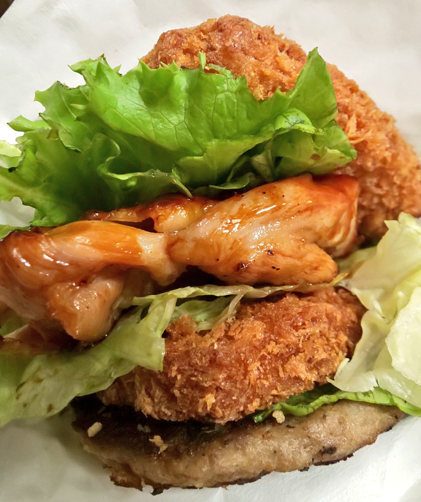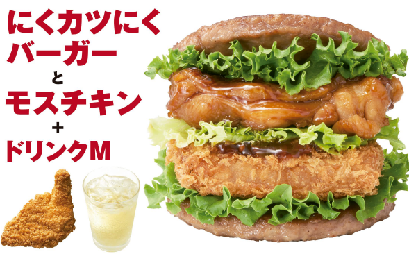 ▼原有的漢堡麵包以2片牛肉肉排取代,中間則是以生菜包夾了照燒雞腿排、豬肉排,套餐再附一塊雞排和中杯飲料。單點售價為887日幣(約250台幣)含稅,搭配套餐則為1386日幣(約390台幣)。