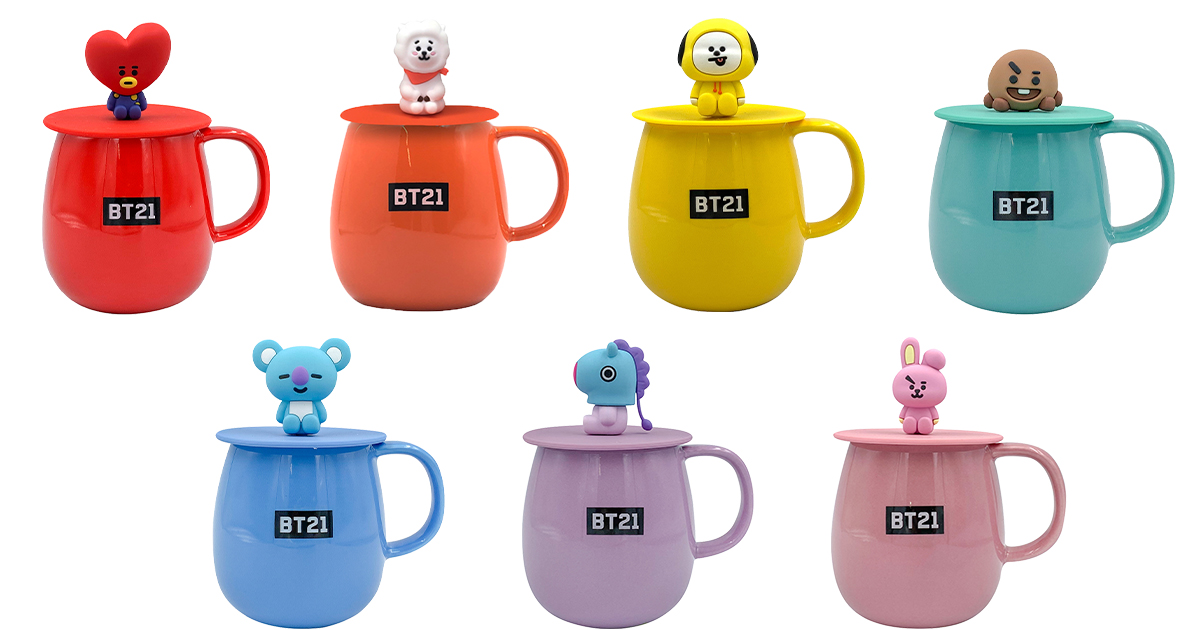 ▼BT21馬克杯:共7款(KOYA、RK、SHOOKY、MANG、CHIMMY、TATA、COOKY),立體設計杯蓋,宇宙明星們就坐在蓋上,萌出新高度;杯身配色採用宇宙明星各自不同的代表色,杯蓋還可任意搭配各種不同馬克杯,自在取用。2000點+429元可換一款。
