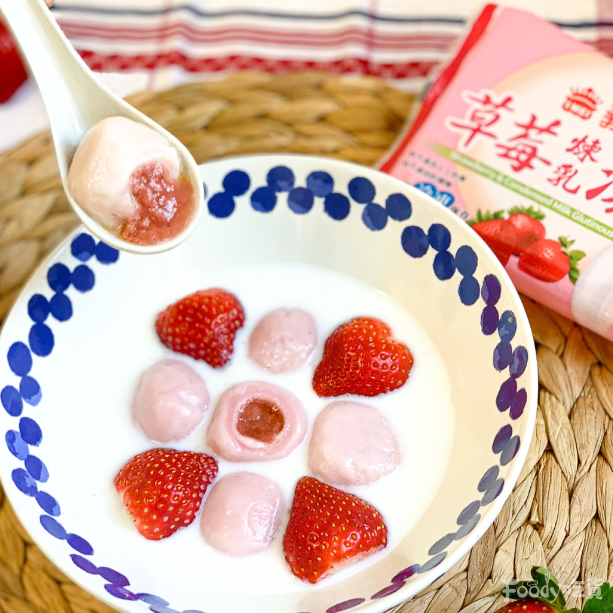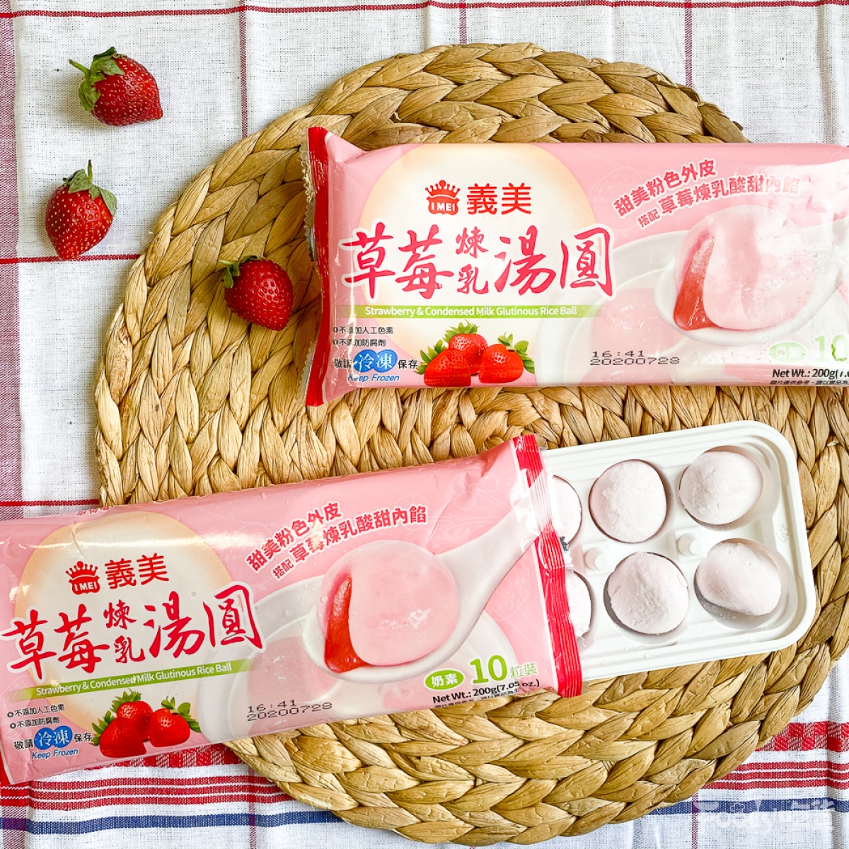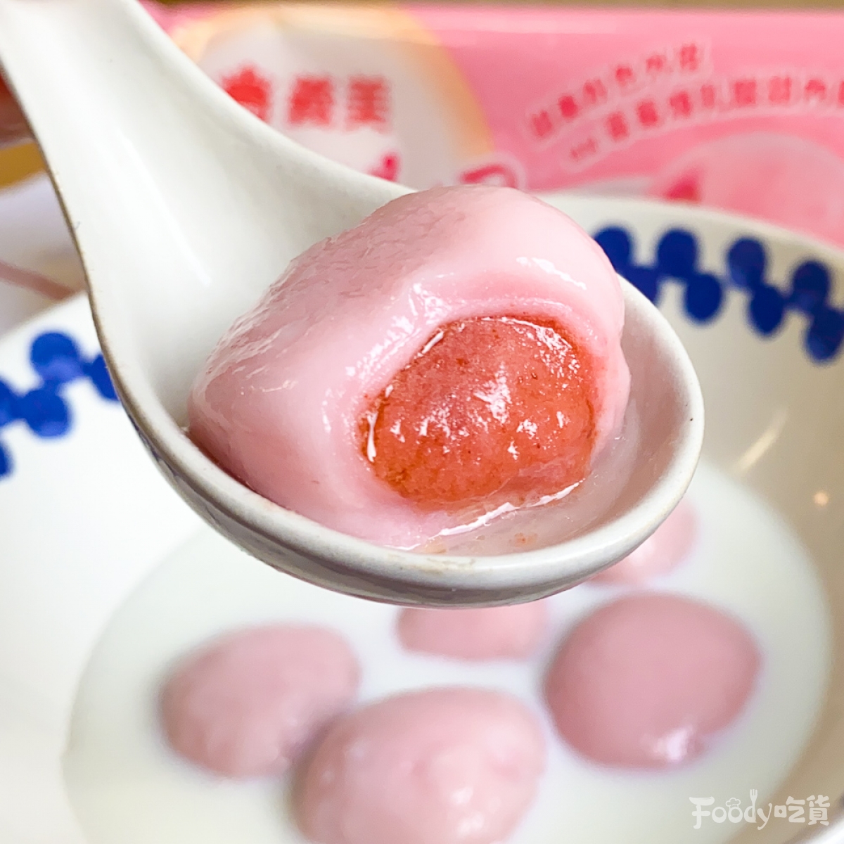 ▼「義美草莓煉乳湯圓」售價55元,甜美粉色外皮搭配草莓煉乳酸甜內餡煉,使用義美鮮乳製作,香醇濃郁!