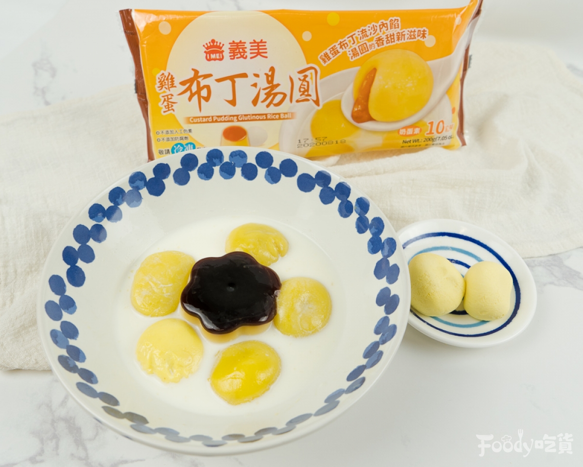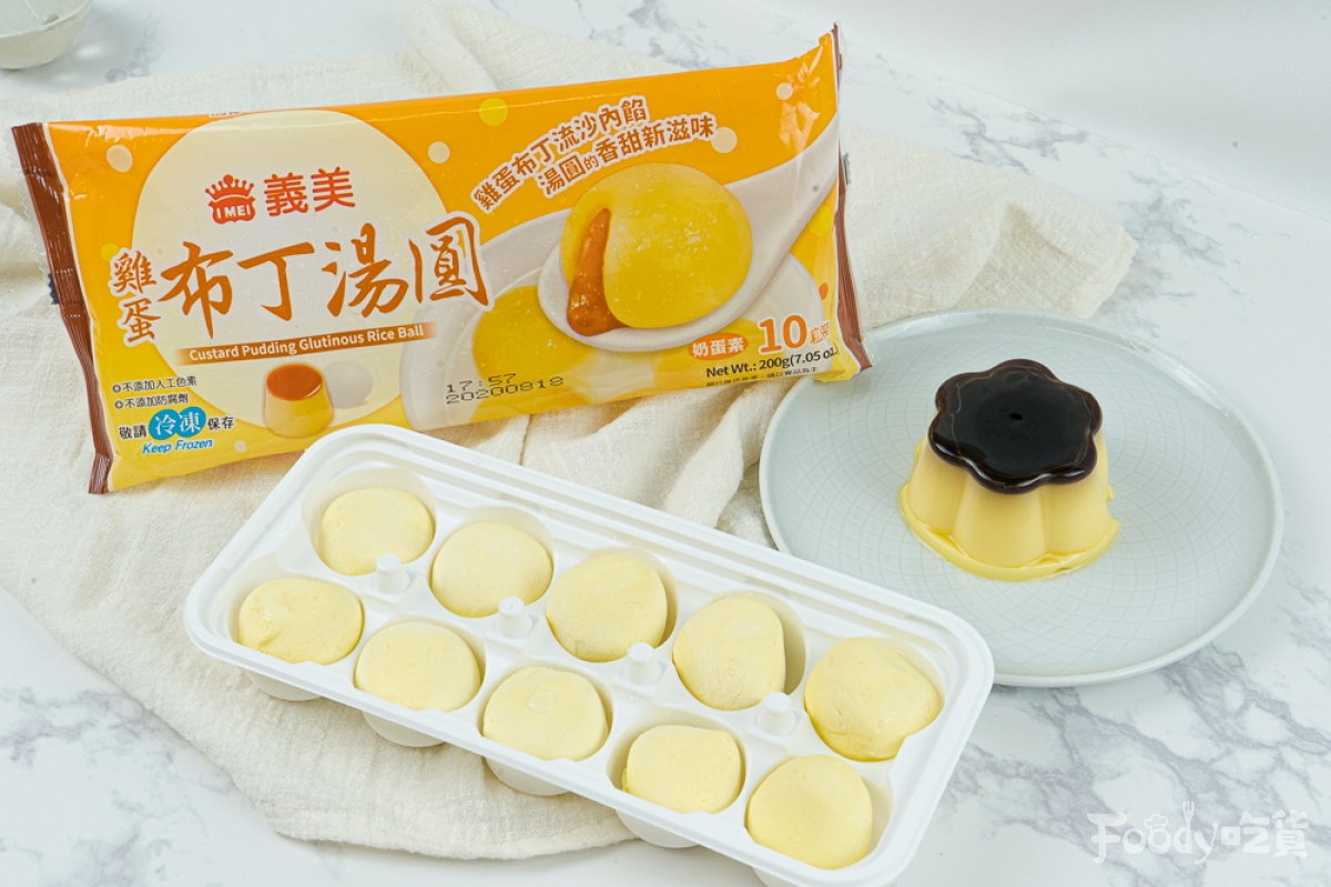 ▼「義美雞蛋布丁湯圓」售價55元,首創湯圓黃色外皮,雞蛋布丁流沙內餡,香甜新滋味!