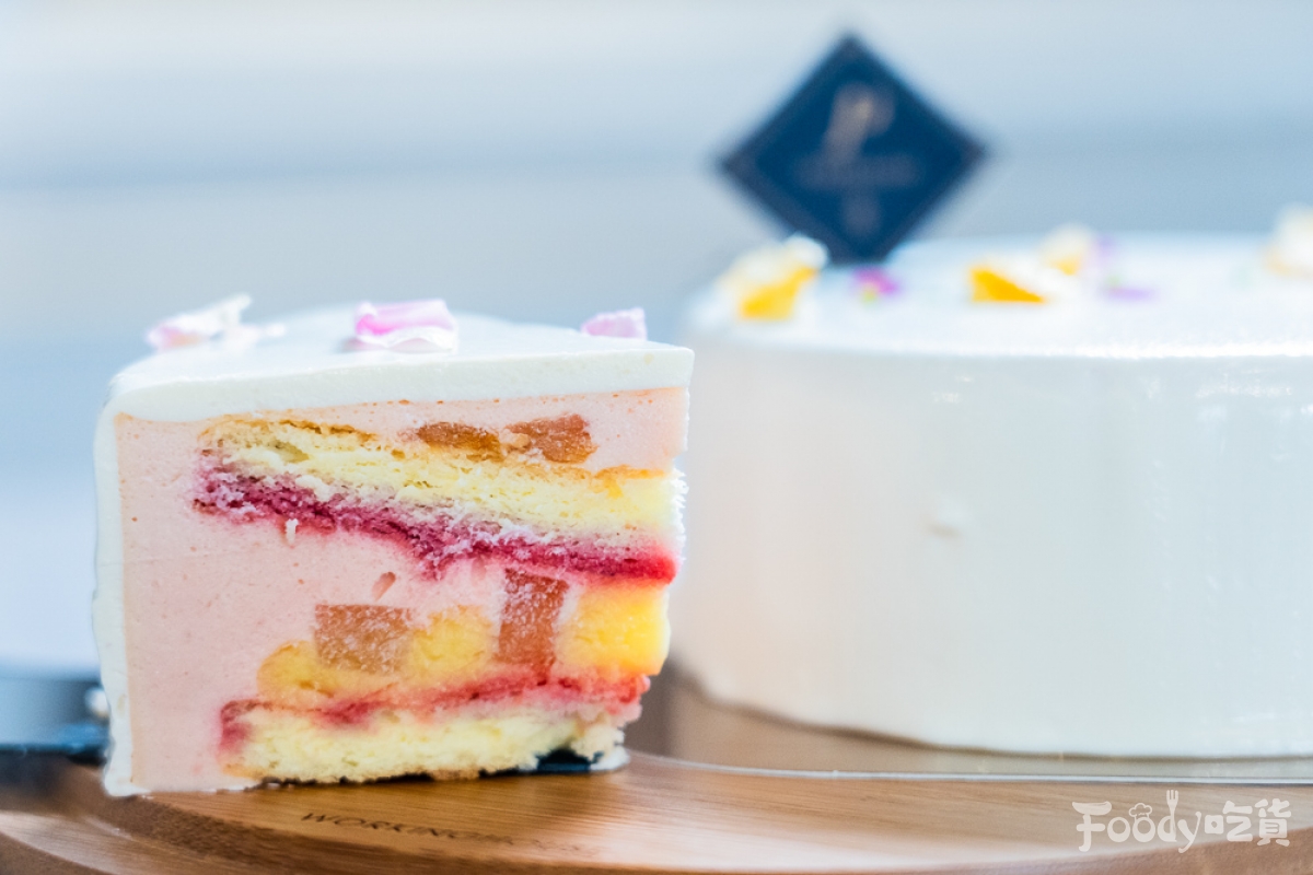 ▼慕斯使用蜜漬柚子醬、現榨法國檸檬汁與葡萄柚果泥、打發法國鮮奶油與並拌入少許覆盆莓果泥製成;粉色的慕斯包裹著繽紛的糖漬韓國柚、檸檬柚子醬與檸檬凍,蛋糕體裹上覆盆莓酒糖液,不但微酸的內餡帶有一絲清甜、充滿果香,層層疊疊的切面也美得讓人忘記呼吸。