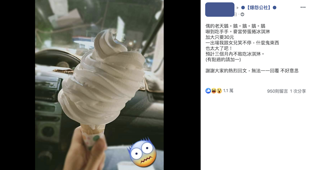 2019年12月06日大家還記得先前介紹過麥當勞「特大號隱藏版蛋捲冰淇淋」嗎?長大版的蛋捲冰淇淋讓人吃了超滿足。日前有一對母女在麥當勞也點了加大蛋捲冰淇淋來嚐鮮,沒想到拿到的冰淇淋讓網友都笑翻了~