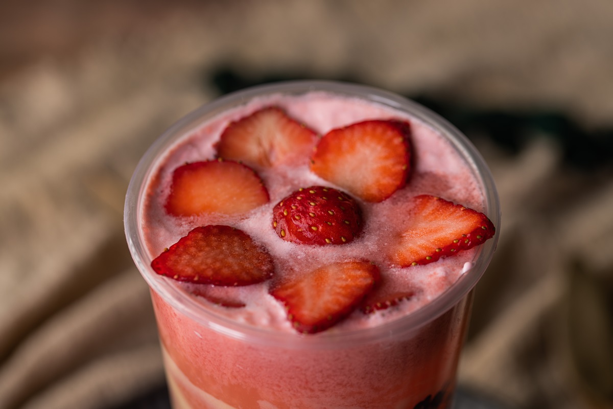 ▼被譽為台中最美手搖飲的「青釉茶事」,以青花瓷藍白色調的設計聞名,這次跟上草莓季風潮,推出這款粉嫩的「草莓布蕾」,以青茶為基底,加入新鮮草莓丁以及與帶有草莓香甜味的奶蓋,最後再杯口放上美美的草莓切片花,滿滿的草莓精髓通通都濃縮在這杯裡,今年草莓季怎麼能不來一杯呢~