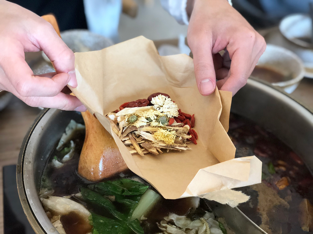 ▼杏春德記一整個瀰漫了濃濃的老中醫風,就連擺盤都講究「五行」;各種湯頭帶有一絲清香的藥膳味,而且還會隨鍋附上一包中藥,好像真的到中藥房去抓藥一樣;裡面是紅棗、黃耆、枸杞等藥材,加入鍋中不但可以讓藥膳味更濃厚一些,也能增添清甜滋味。由於整道鍋都是用溫和的中藥「溫補」,不用擔心不小心補過頭~