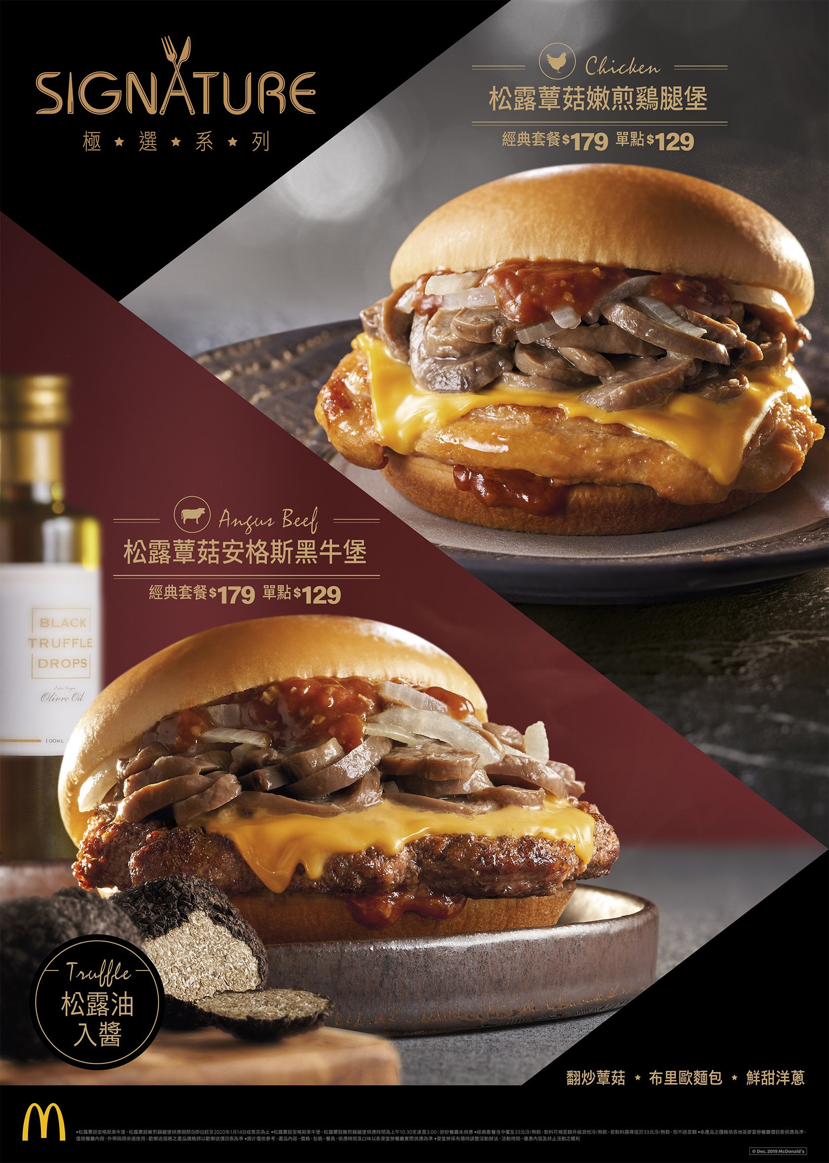 「松露蕈菇安格斯黑牛堡」、「松露蕈菇嫩煎鷄腿堡」 2019年12月11日起至2020年1月14日止限期供應或售完為止,單點129元;經典套餐179元。