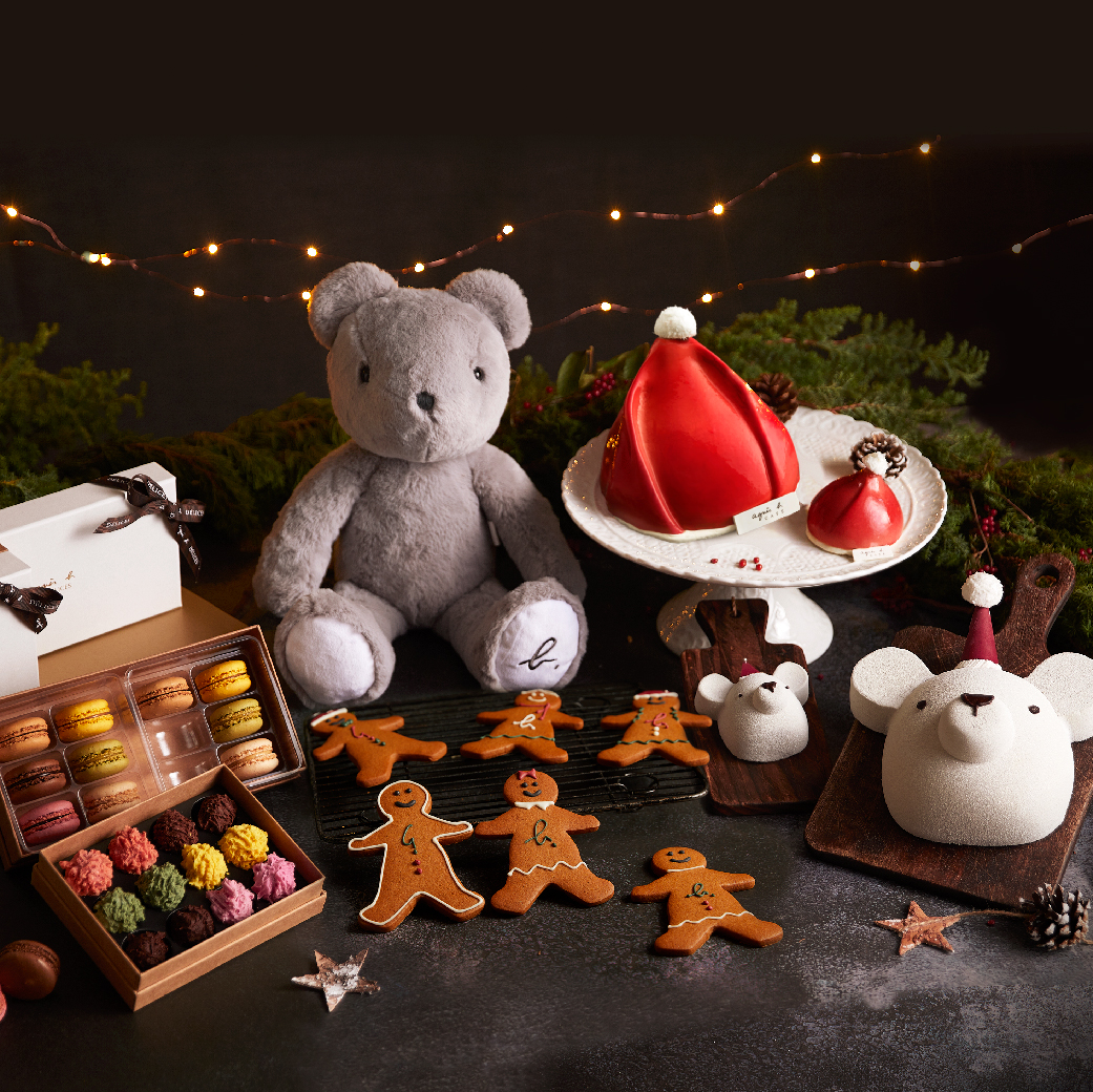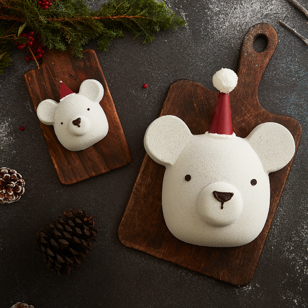 ▼備受歡迎的小熊蛋糕,聖誕限定版戴著派對禮帽,可愛討喜,選用 33%牛奶巧克力、白巧克力、榛果巧克力等多款巧克力,融入頂級法國發酵奶油,口感綿密滑順,並以海鹽點綴,甜中帶鹹交織出層次風味。