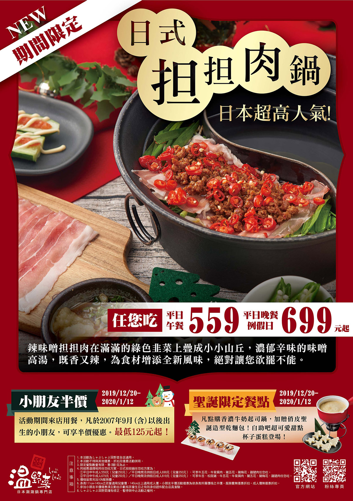 2019年12月12日在冷冷的寒冬中能吃到熱呼呼的火鍋絕對是最幸福的事!今年冬季,來自日本的しゃぶしゃぶ温野菜涮涮鍋特別推出「担担肉鍋」,就是要用美味料理溫暖饕客們的心,除此之外12 月 20 日起至 2020 年 1 月 12 日止,凡於 2007年 9 月後出生的小朋友,來店用餐還能享半價優惠,沒吃到實在太可惜啦!