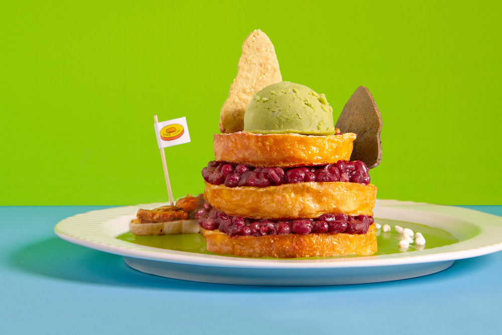 ▼「東茶島-煎茶紅豆」$320,選用來自花蓮〈舞間茶心〉濃郁和風煎茶製成的煎茶奶醬,Q軟綿密的鬆餅間夾的是甜而不膩的蜜紅豆,再盛上一球有著迷人茶香的煎茶冰淇淋,是款日式經典的在地風味組合。