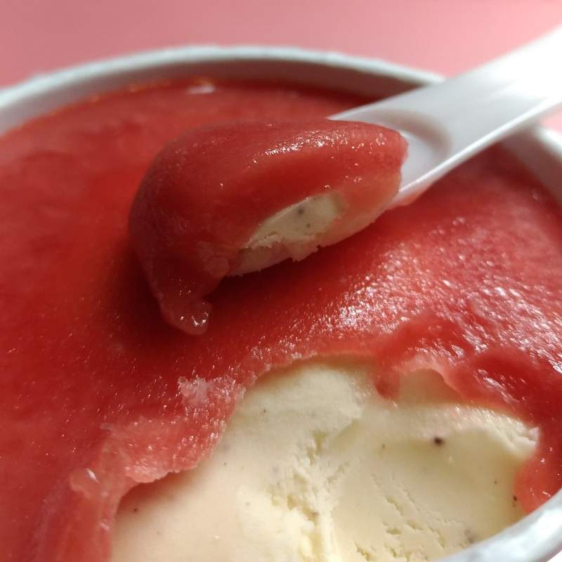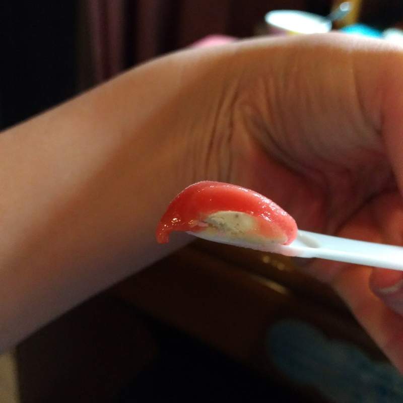▼原來最上面一層草莓,搭配下層的冰淇淋,看起來就好像在吃鮭魚壽司的感覺!