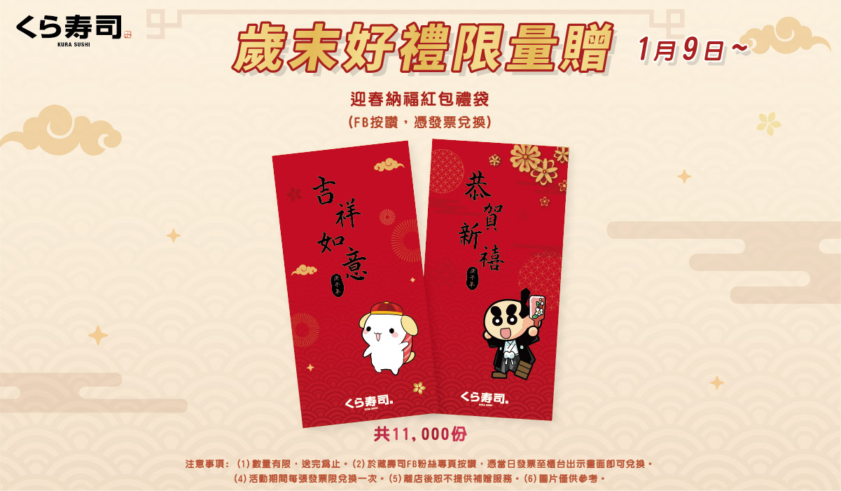 ▼為迎接農曆新年,藏壽司也特別推出全店舖消費贈獎活動「歲末好禮限量贈」,2020年1月9日起到藏壽司任一店鋪用餐,並於該店藏壽司官方粉絲團按讚成為粉絲,即可免費兌換印有壽司寵物及無添丸圖樣的可愛紅包袋(一份2入),數量有限送完為止。