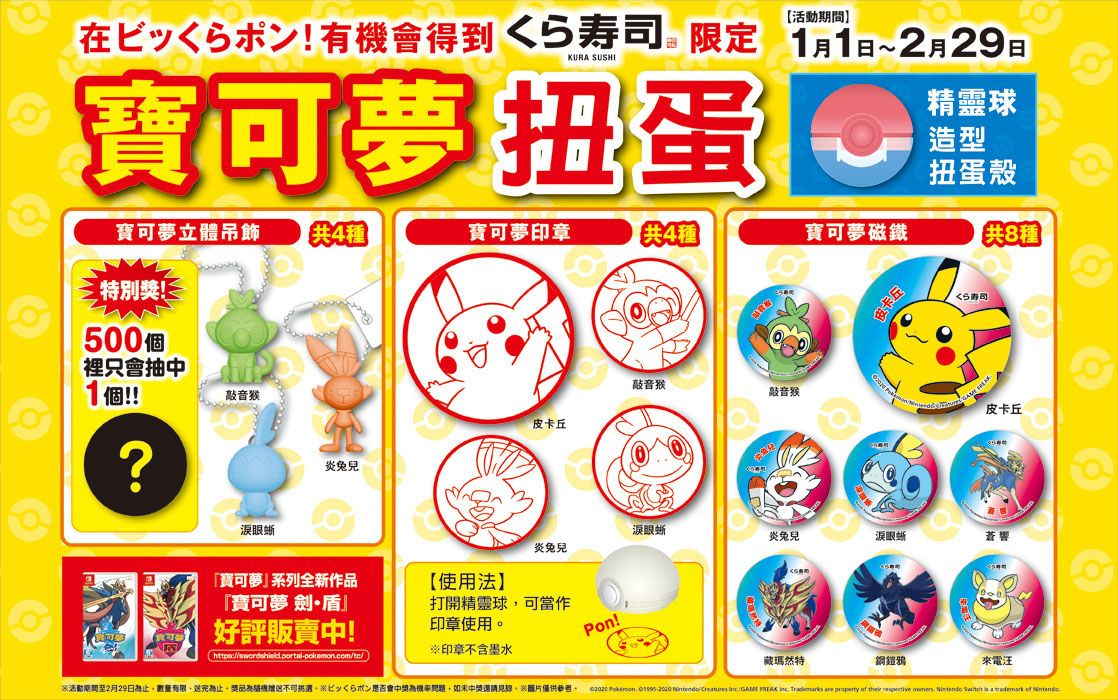 2019年12月26日藏壽司每次推出新的扭蛋,都讓人忍不住想去吃一波~這次選在2020年元旦起推出與新作《寶可夢劍/盾》聯名扭蛋,包括御三家立體吊飾、寶可夢磁鐵跟印章共16款獨家限定扭蛋,活動期間快到全台藏壽司分店開吃!