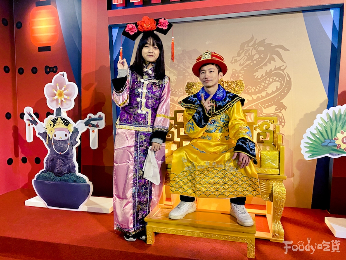 ▼「後宮盆惱傳」片場:美樂蒂竟然穿越到了「盆惱」扭蛋系列的王國中,成為「盆惱」的一員?而在盆惱王國裡等待著的,竟然是蛋黃哥、大眼蛙公公,與那熟悉的無口身影-Hello Kitty!現場還能換裝成清朝皇帝,讓Hello Kitty貴妃陪你一起拍照~