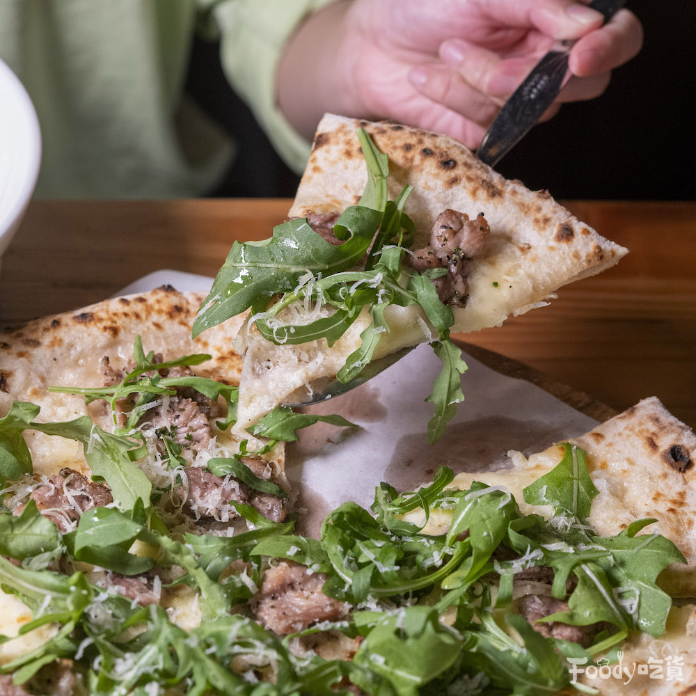 ▼鹽烤香草紅櫻豚披薩:新推出的披薩使用肉質細膩的「紅櫻豚」,油脂均勻分布、肥瘦適中,烤起來不會過乾,鮮美的肉味搭配每日更換的不同的菜葉(去吃的時候是用芝麻葉)、滋味清爽,而披薩是是道地的窯烤餅皮、散發淡淡的麵粉香。整體沒有過多調味,能品嚐到食材最真實、原始的滋味;若是比較重口味的人,也可以搭配一旁附的沾醬一起享用。