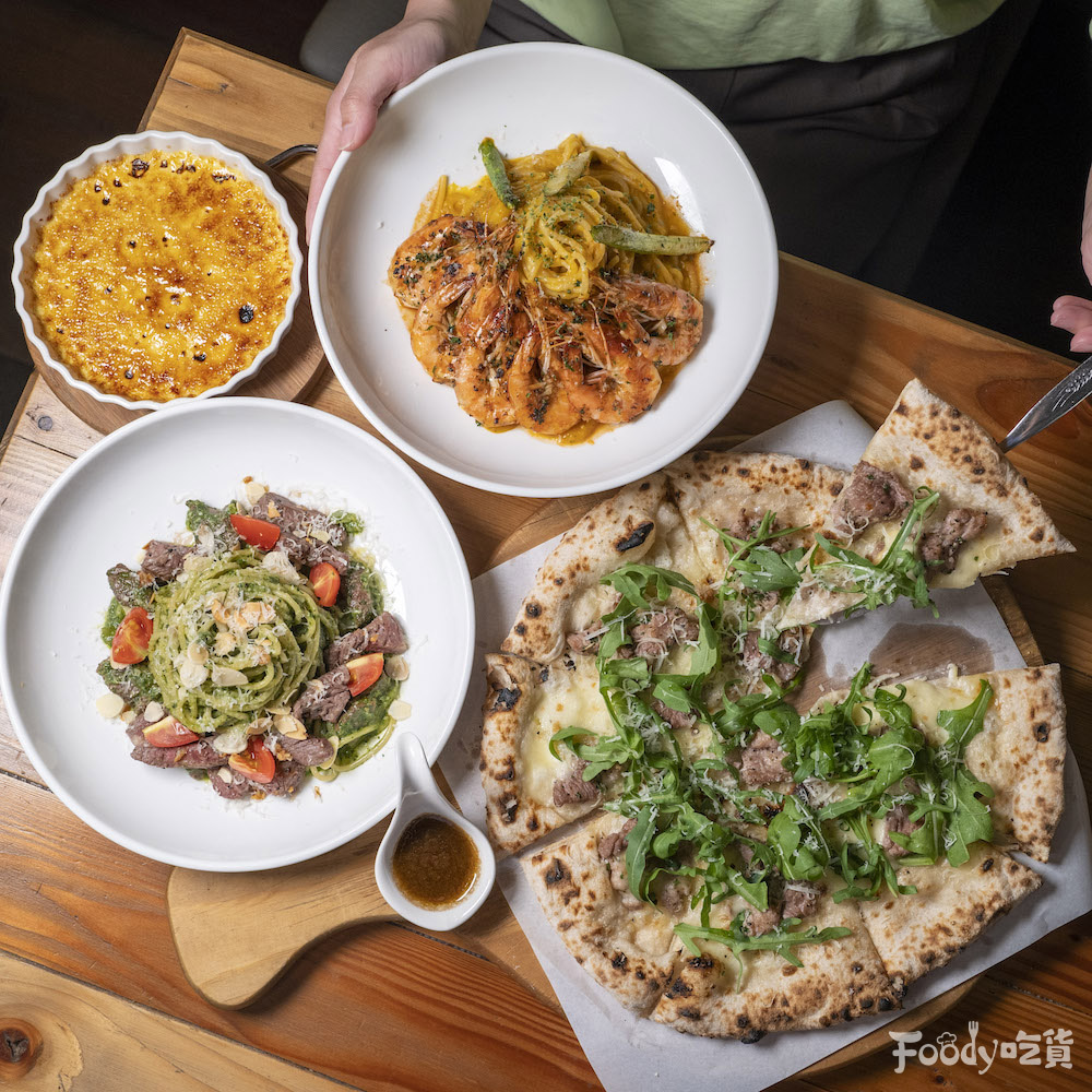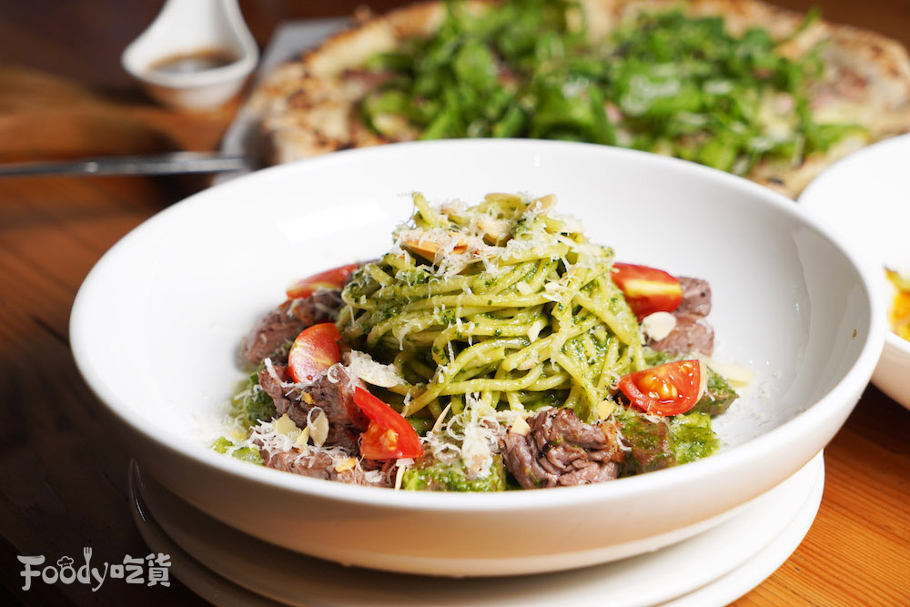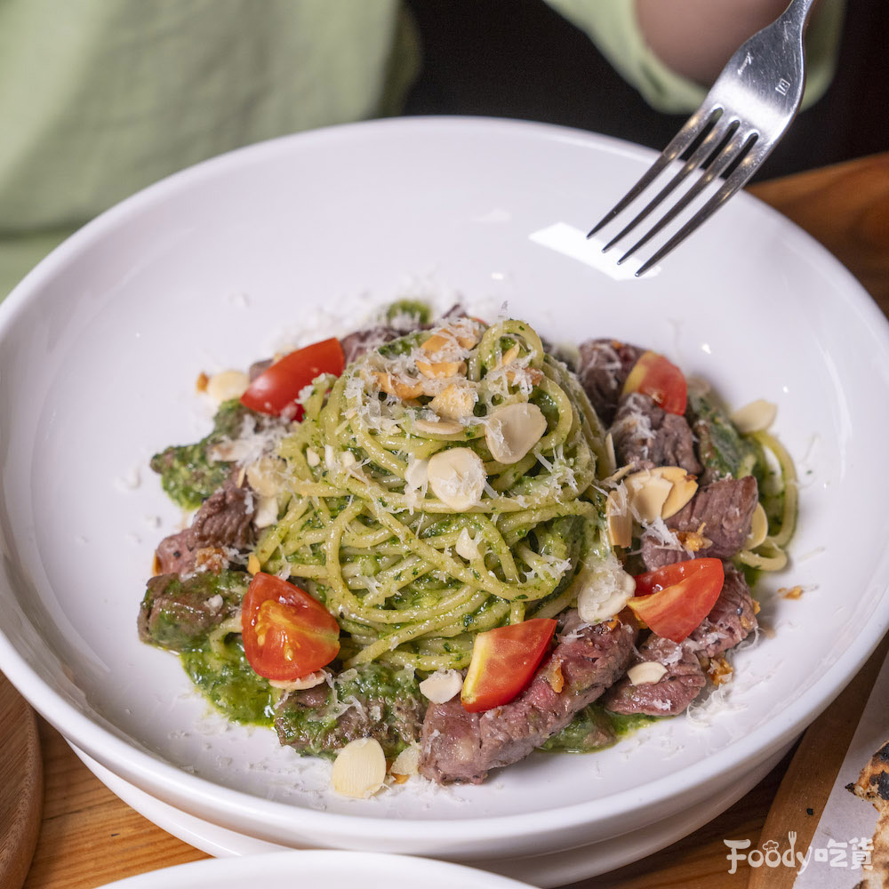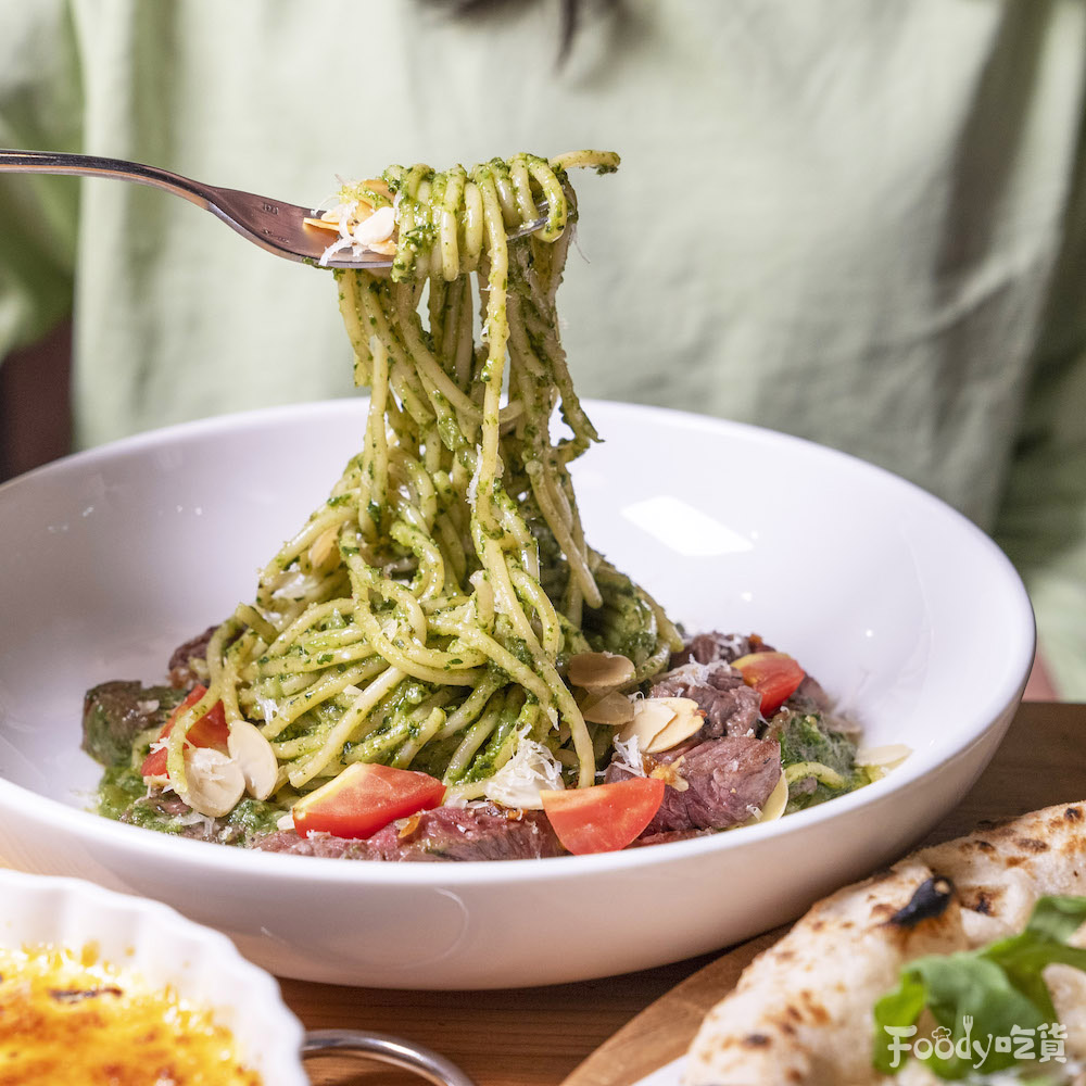 ▼松子羅勒骰子牛義大利麵:青醬均勻地裹在軟硬適中的麵體上,每一口都能嚐到濃郁羅勒香,卻不會蓋過料理中淡淡的松子香氣;香嫩的牛肉煎得恰到好處,方便吃的一口大小、咬下去滿滿的肉汁與肉香在嘴裡溢出,適合愛吃肉的人。