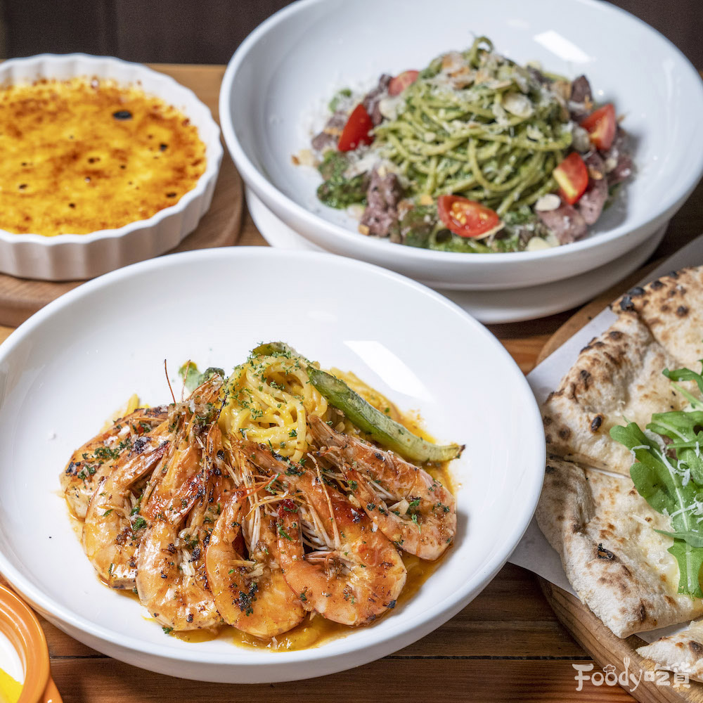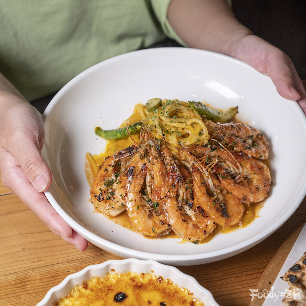 ▼南瓜鮮蝦蘆筍義大利麵:以綿密的南瓜為基底拌炒,香甜南瓜泥濃郁口感、爽脆蘆筍獨特滋味、鮮甜蝦子的海味跟義大利麵的麵體超對味;整道料理吃起來清爽無負擔、卻又能讓人非常滿足。