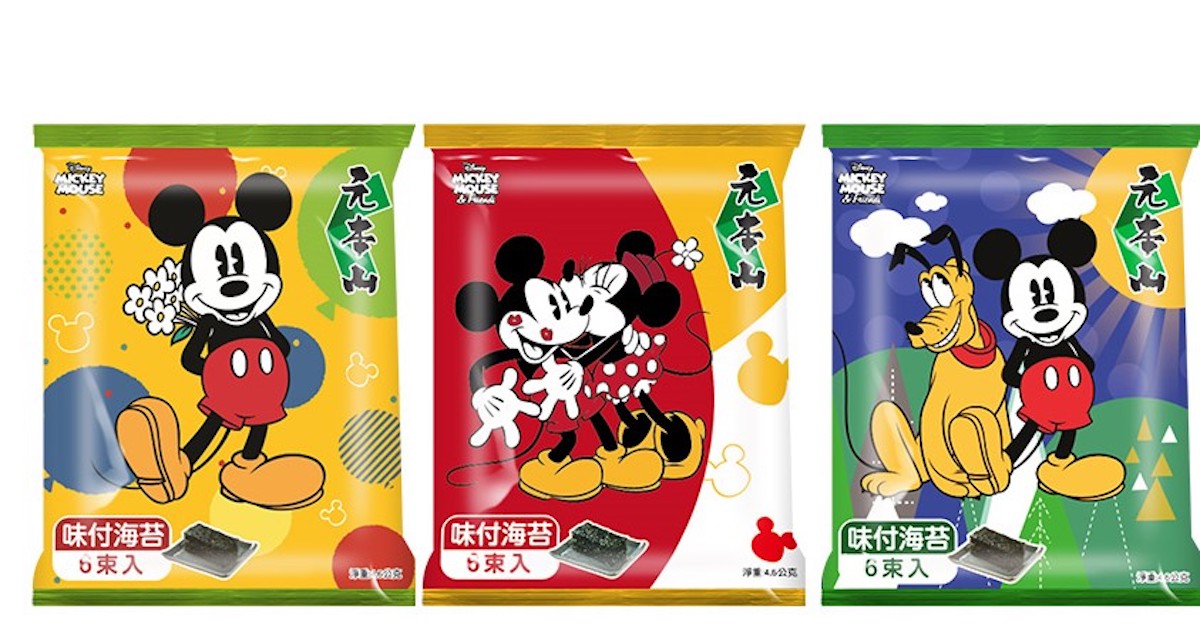 ▼元本山卡通海苔(原味):米奇搭配色彩鮮豔的多款設計包裝、吸睛又可愛;採用元本山優質味付海苔,香脆可口。