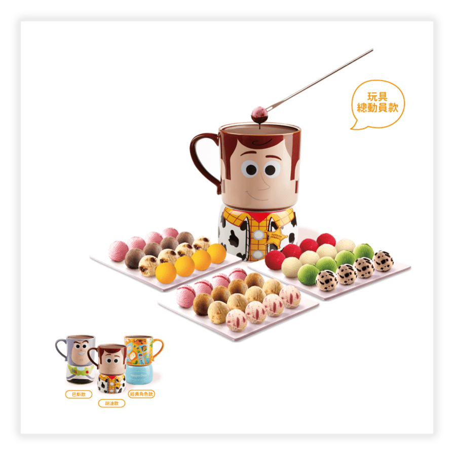 ▼另一款「玩具總動員」冰淇淋巧克力鍋也超萌,巧克力盅還有胡迪、巴斯光年和玩具總動員4的圖樣可以選擇,在跨年時與親友們一起品嚐未免太幸福啦~