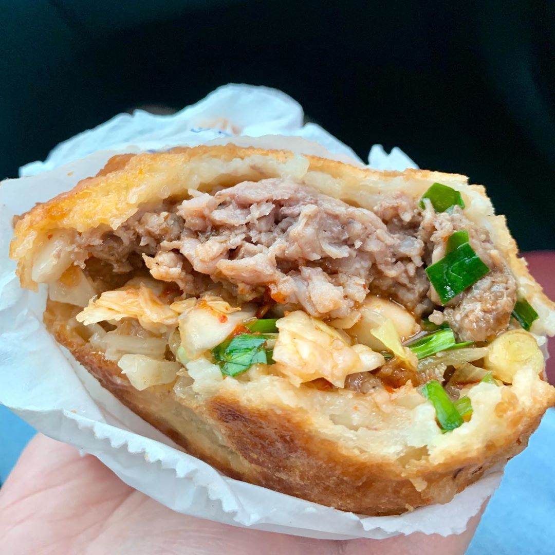 ▼看看這在油鍋中上色得金黃酥脆的外皮,還有鮮嫩多汁的肉餡就知道了吧!曾記餡餅料好實在,塞滿滿的肉餡、爽口清脆的高麗菜,搭配充滿油香與麵粉香的餡餅皮,大大一顆吃起來超滿足,直接從下午飽到宵夜;而且竟然只要35元(豬肉)、40元(牛肉)銅板價,完全是佛心來著。