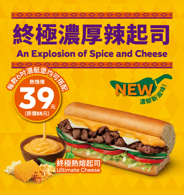 販售地點:全台SUBWAY門市皆有販售販售方式:凡是點購任一款6吋潛艇堡,即可以39元加價購加點一份「終極濃厚辣起司」。另有「終極熱熔起司墨西哥辣牛堡、終極熱熔起司火腿堡」兩款口味。